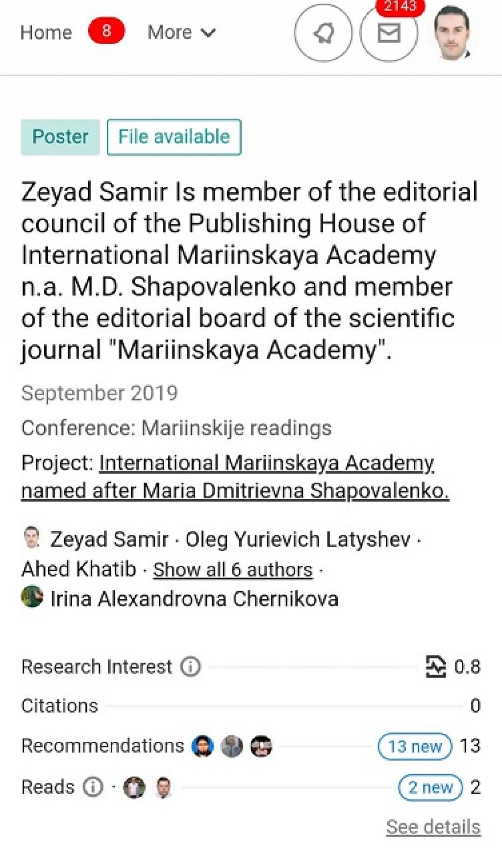 اختيار الدكتور زياد سمير زكي التدريسي في فرع السياسة العامة بكليتنا عضوا في مجلس تحرير دار النشر الدولية لأكاديمية ماريانسكايا إم دي شابوفالينكو