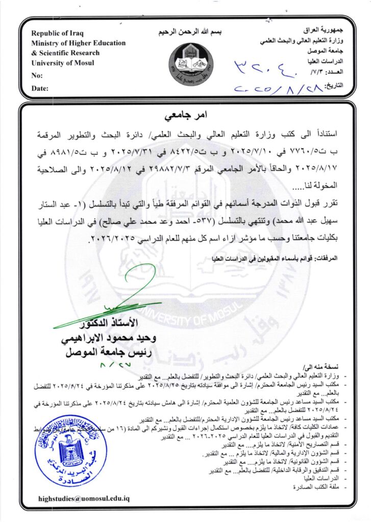 اعلان المقبولين في الدراسات العليا لكلية العلوم السياسية للعام الدراسي 2025 – 2026