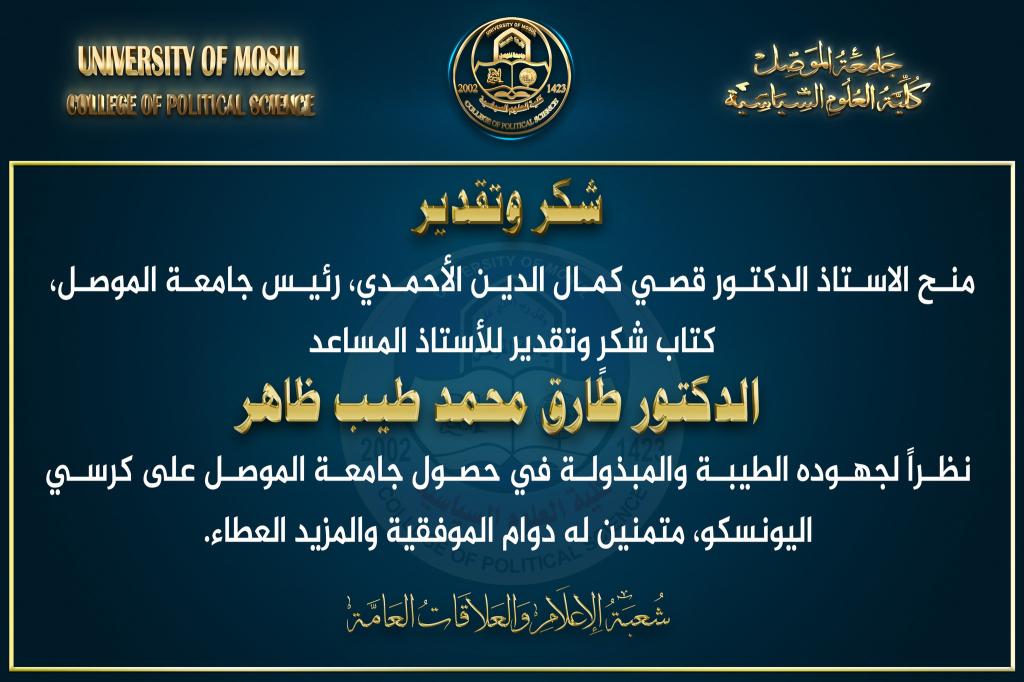 منح الأستاذ الدكتور قصي كمال الدين الاحمدي رئيس جامعة الموصل، كتاب شكرٍ وتقدير للأستاذ المساعد الدكتور طارق محمد طيب ظاهر عميد كلية العلوم السياسية، نظراً لجهوده الطيبة والمبذولة في حصول جامعة الموصل على كرسي اليونسكو.