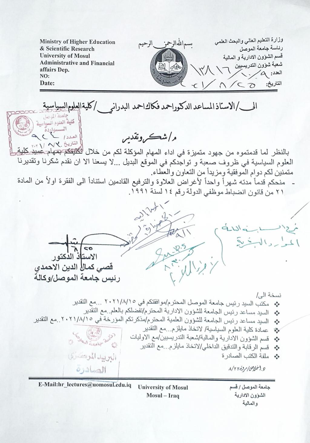 منح السيد رئيس جامعة الموصل الأستاذ الدكتور قصي كمال الدين الأحمدي كتاب شكر للأستاذ المساعد الدكتور أحمد فكاك البدراني تثميناً لجهوده المتميزة أثناء توليه مهام عميد كلية العلوم السياسية في ظروف صعبة والتواجد في الموقع البديل ..