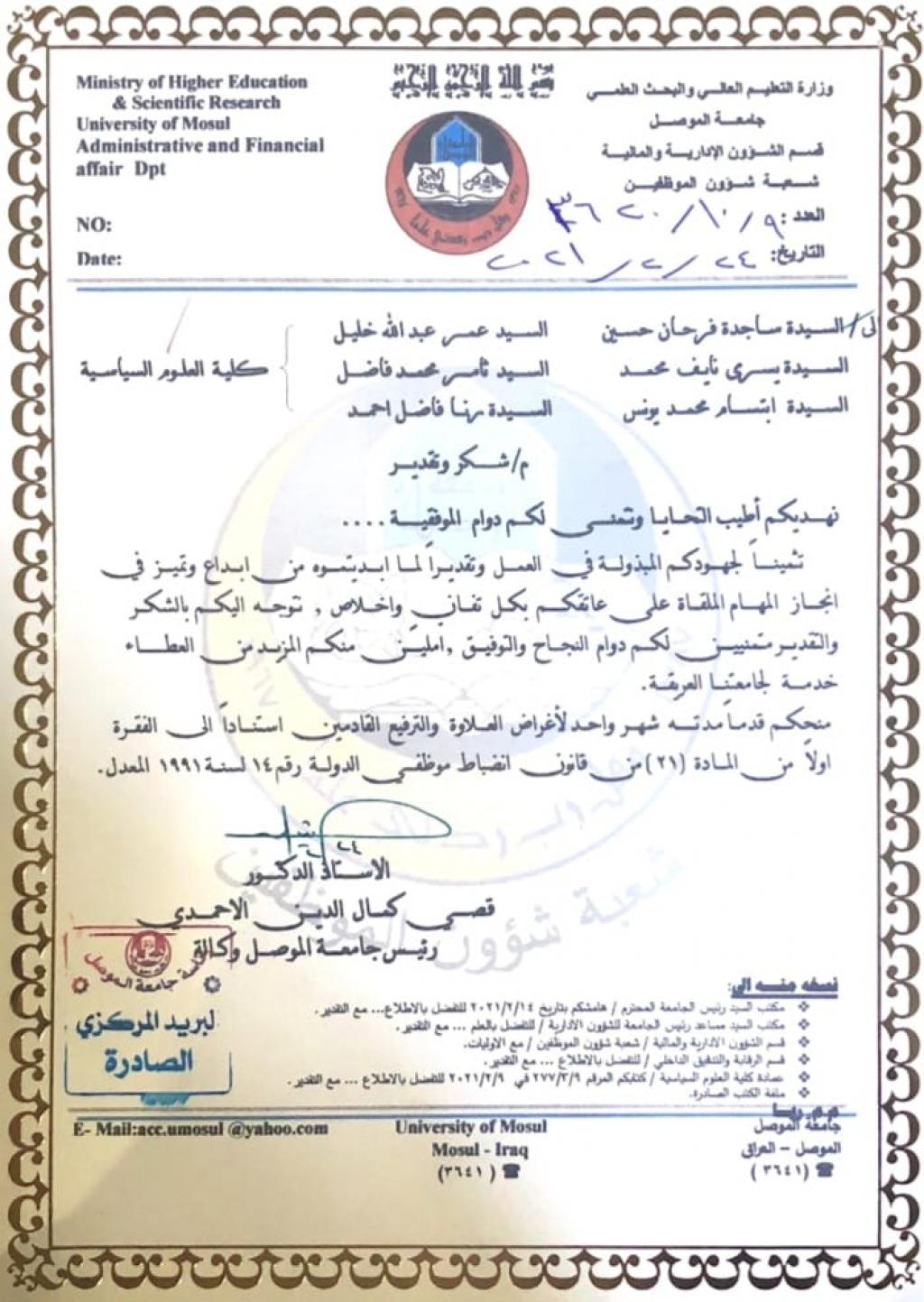 منح السيد رئيس جامعة الموصل الأستاذ الدكتور قصي كمال الدين الأحمدي كتاب شكر وتقدير لملاكشعبة شؤون الطلبة والتسجيل في كلية العلوم السياسية ممثلا بالذوات المدرجة اسماؤهم في أدناه :١- السيدة ساجدة فرحان حسين مسؤولة شعبة شؤون الطلبة والتسجيل .٢- السيد عمر عبدالله خليل .٣- السيدة يسرى نايف محمد .٤- السيد ثامر محمد فاضل .٥- السيدة ابتسام محمد يونس .٦- السيدة رنا فاضل احمد .وجاء التكريم تثمينا لجهودهم وانجازهم المهام الملقاة على عاتقهم ..