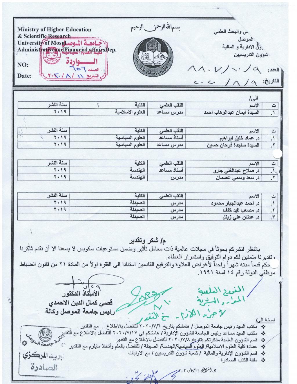 منح السيد رئيس جامعة الموصل الاستاذ الدكتور قصي كمال الدين الاحمدي كتابَ شكر وتقدير للتدريسيَين في كليتنا:١ – ا.م.د عماد خليل ابراهيم رئيس فرع العلاقات الدولية.٢- المدرس المساعد ساجدة فرحان حسين الجبوري.لنشرهما بحوثاً علمية في مجلات عالمية ذات معامل تأثير وضمن مستوعبات سكوبس Scopus.ألف مبارك …