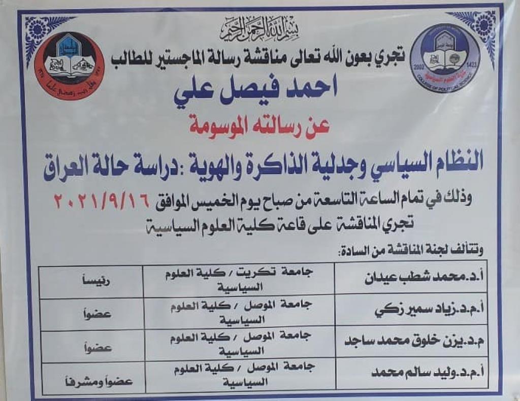 (النظام السياسي وجدلية الذاكرة والهوية : دراسة حالة العراق) عنوان لرسالة ماجستير جرت مناقشتها في كلية العلوم السياسية