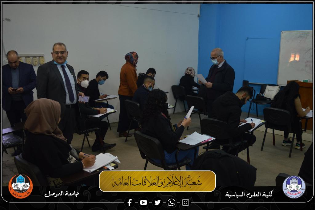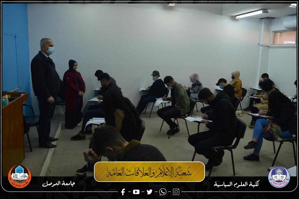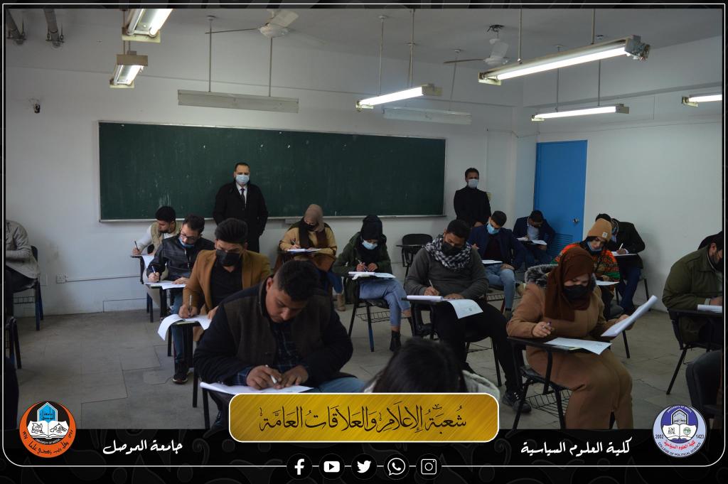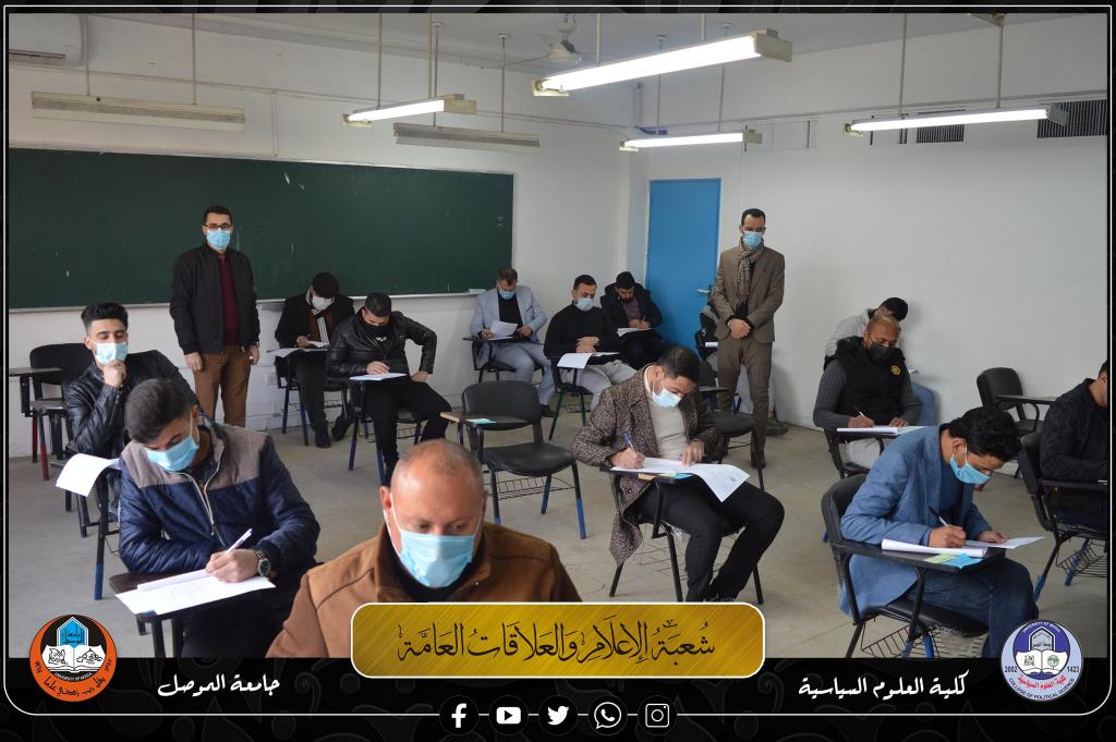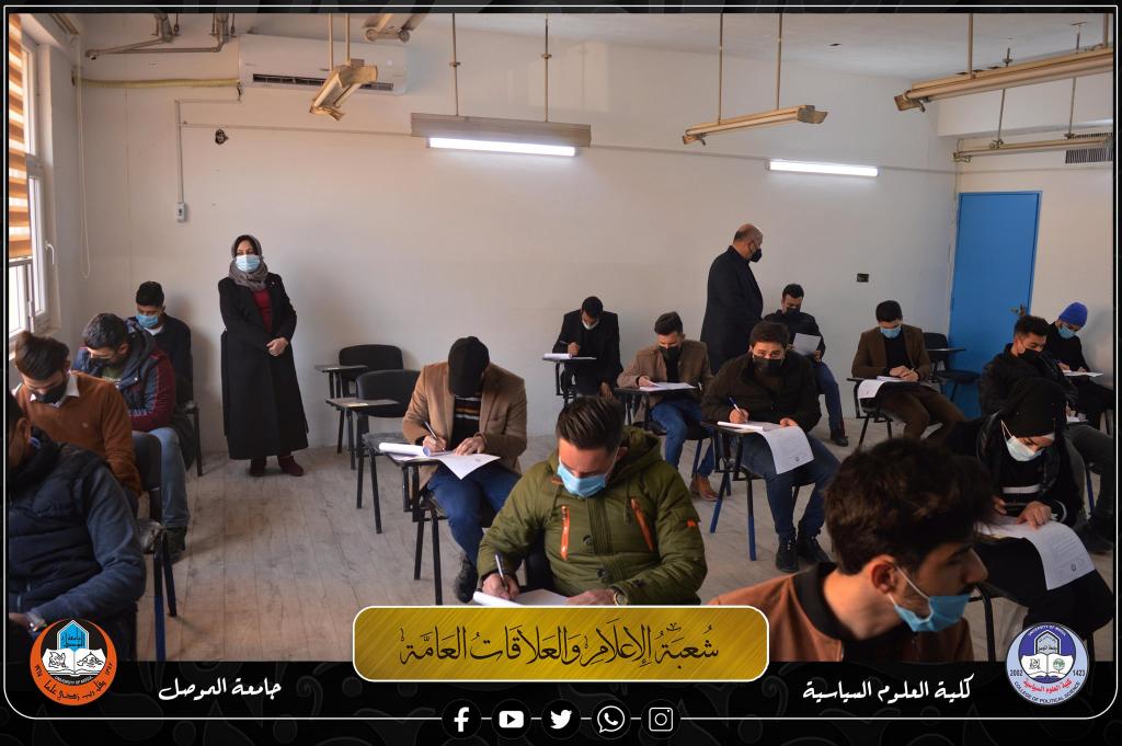 طلبة الدراسات الأولية (الصباحية والمسائية) في كلية العلوم السياسية، يجرون أولى امتحانات نصف السنة الحضورية للعام الدراسي 2021-2022 صباح يوم الاحد الموافق 2022/1/30، بعد تعفير جميع القاعات الامتحانية والإلتزام بإجراءات التباعد الإجتماعي وإرتداء الكمامات واجراء فحوصات PCR.موقع كلية العلوم السياسية على الويب https://www.uomosul.edu.iq/ar/politicalScienceموقع كلية العلوم السياسية على منصة تويتر https://twitter.com/SciencesCollegeموقع كلية العلوم السياسية على منصة يوتيوبhttps://www.youtube.com/channel/UCm1S8mj-ObhfAKwBdLnU9MQ