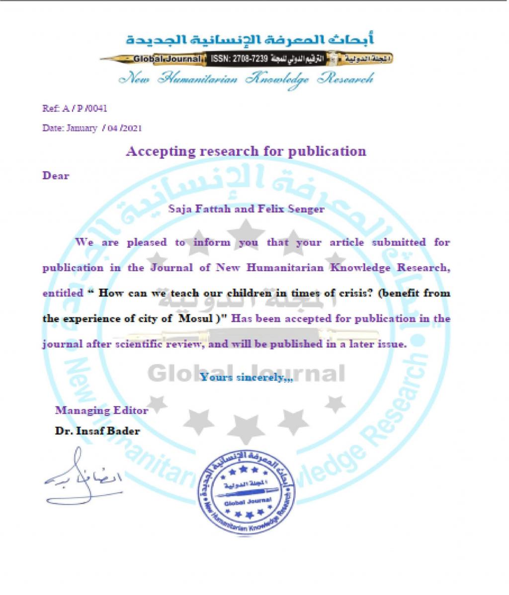 نشرت التدريسية في فرع السياسة العامة ، السيدة سجى فتاح زيدان بالتعاون مع الباحث (felx senger) من جامعة دورتموند الألمانية ، بحثاً علمياً في مجلة ( أبحاث المعرفة الإنسانية الجديدة) التي تصدر في المملكة الأردنية الهاشمية .وحمل البحث عنوان (كيف نعلم أطفالنا في أوقات الأزمات ؟ الاستفادة من تجربة مدينة الموصل) .وتناول البحث كيفية الاستفادة من تجربة مدينة الموصل في مجال تعليم الأطفال غير الملتحقين بالمدرسة .إذ إن الاغلاق الصحي بسبب جائحة كورونا ولد وضعاً مشابهاً وهو عدم التحاق الأطفال بالمدارس .وفي الوقت نفسه يعد البحث محاولةً لتعريف العالم بأن مدينة الموصل رغم انقطاع أطفالها عن المدارس إلا أن أولياء الأمور قاموا بتدريس أطفالهم وتعليمهم بطرق منزلية ، أي اعتماد طريقة التعليم المنزلي . وتناول البحث بالشرح بعض طرق التدريس المتبعة من بعض أولياء الأمور في تلك الفترة .