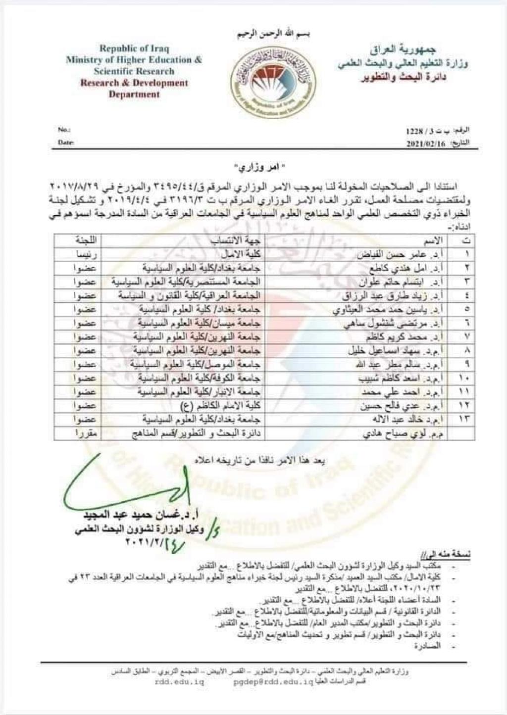 صدر الأمر الوزاري الخاص بتكليف الأستاذ المساعد الدكتور سالم مطر عبدالله التدريسي في فرع السياسة العامة بكلية العلوم السياسية بعضوية لجنة الخبراء ذوي التخصص العلمي الواحد لمناهج العلوم السياسية في الجامعات العراقية.