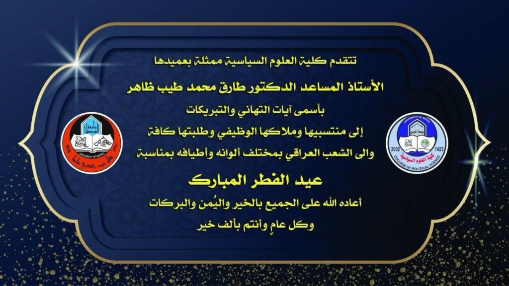 تتقدّم عمادة كُليّة العلوم السياسيّة ممثّلة بالأستاذ المساعد الدكتور (طارق محمد طيّب القصّار) بالتهنئة الحارّة للدكتور (خيرالله سبهان عبدالله الجبوري) بمناسبة تسنّمه منصب المعاون العلمي للكليّة، راجين له التوفيق والسداد في مهامّه التي كُلِف بها، دفعاً لعجلة التقدّم العلمي والمعرفي في فروع الكليّة كافّة، وتحقيقاً للأهداف النبيلة التي تطمح الكليّة في بلوغها، وهو ما يصبّ انتهاءً في مسيرة الارتقاء الوطني الكُبرى التي يبذل الجميع قصارى جهودهم لإدامة زخمها وبلورة مقاصدها العليا.