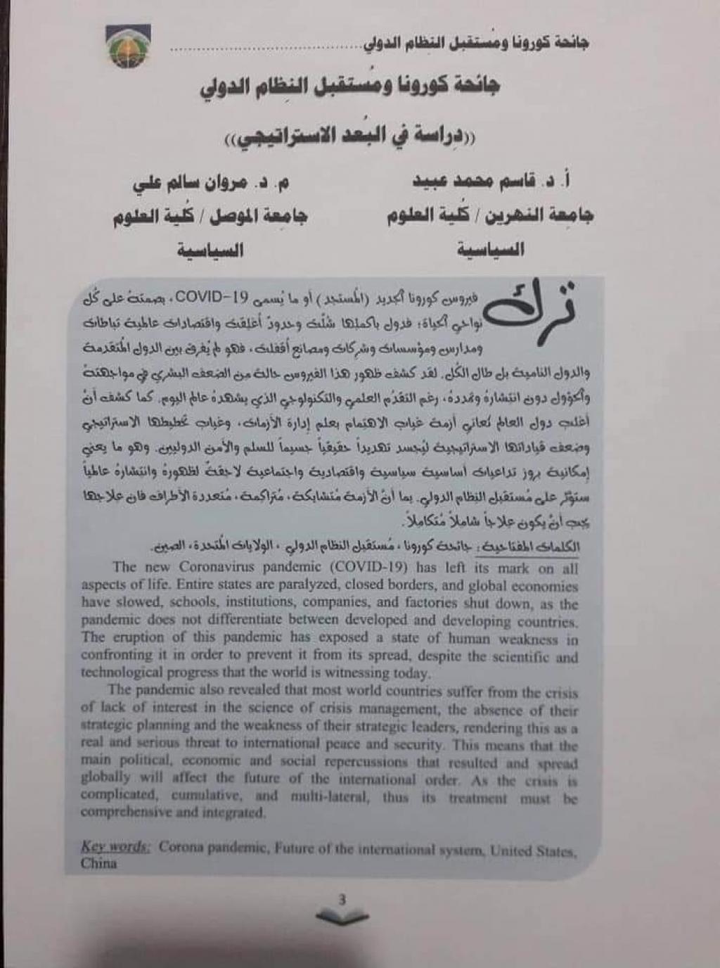 ((جائحة كورونا ومستقبل النظام الدولي : دراسة في البعد الاستراتيجي)) بحث مشترك للدكتور مروان سالم العلي نشر في مجلة (المعهد)