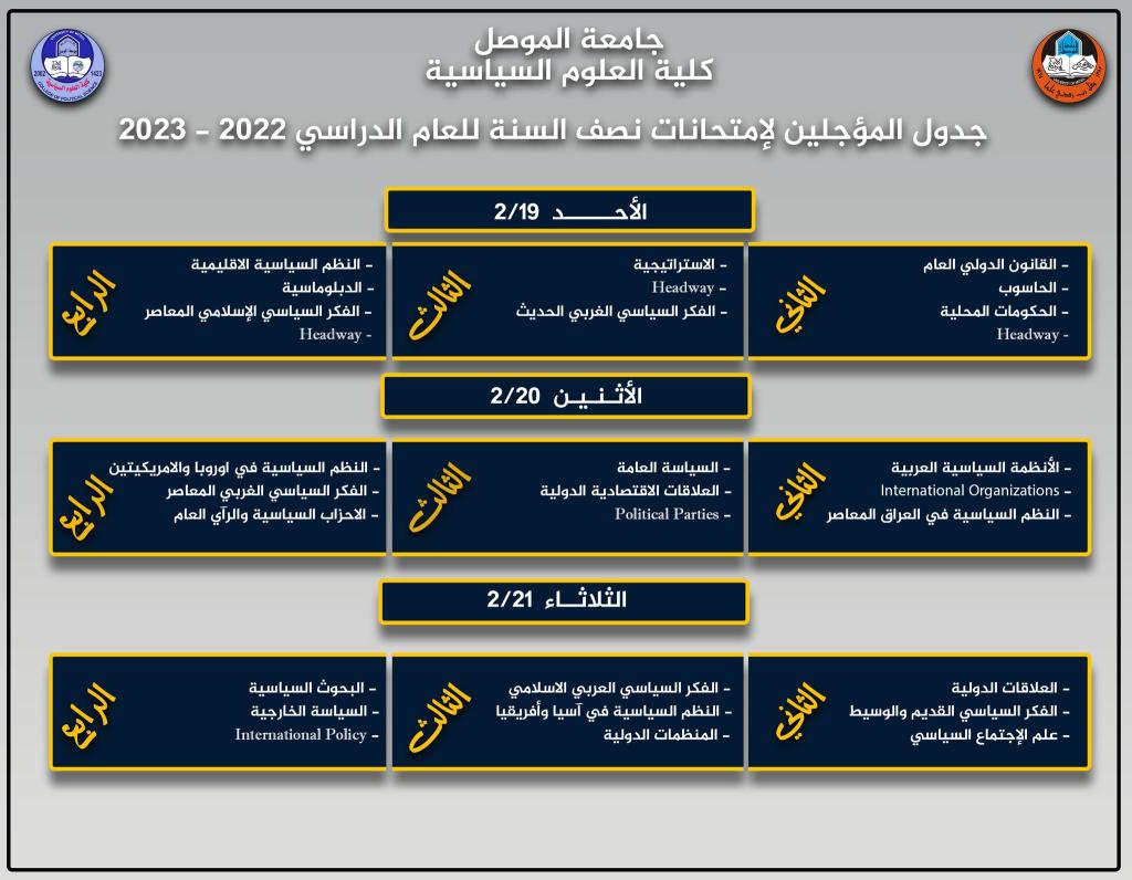 جدول امتحانات نصف السنة لطلبة الدراسات الأولية والتعليمات الامتحانية………………………………………………1. يكون موعد الامتحان لطلبة المرحلة الثانية والرابعة في الساعة التاسعة صباحاً.2. يكون موعد الامتحان لطلبة المرحلة الثالثة في الساعة الحادية عشر صباحاً.3. يتعين على الطالب إبراز الهوية الجامعية عند الدخول الى القاعة الامتحانية.4. يمنع منعاً باتاً ادخال جهاز الهاتف النقال او أي وسيلة اتصال أخرى الى القاعة الامتحانية.5. الإجابة في الدفتر الامتحاني تكون بالقلم الجاف الأزرق او الأسود حصراً.