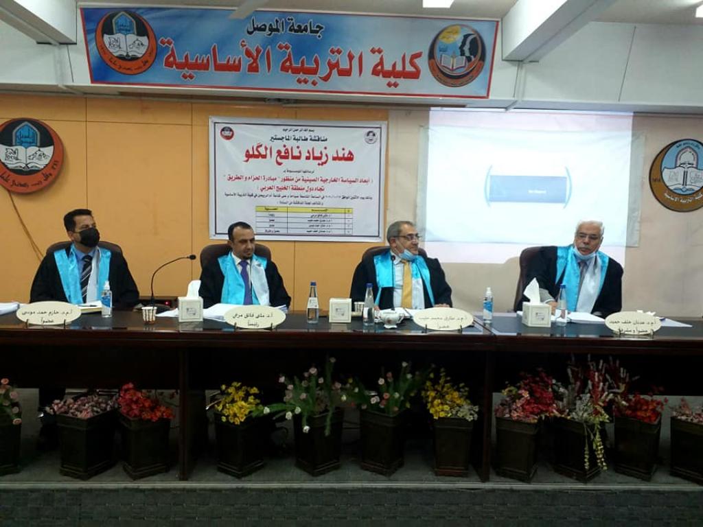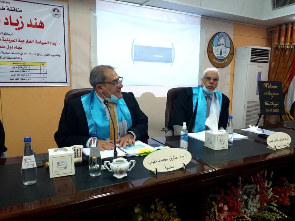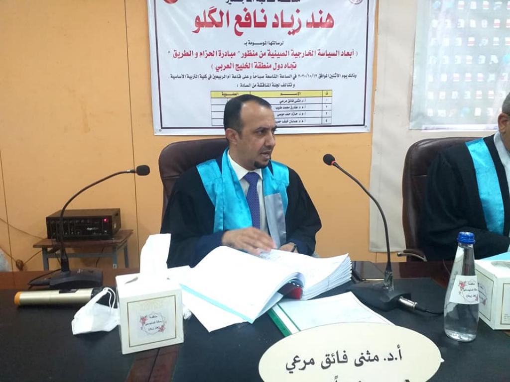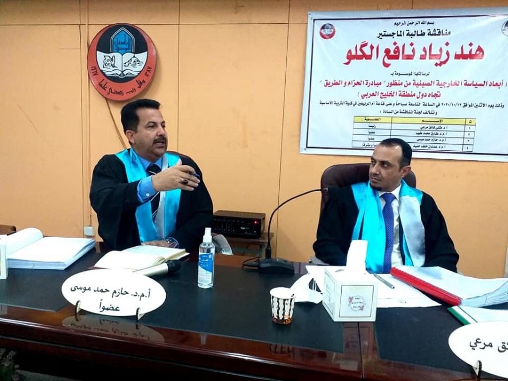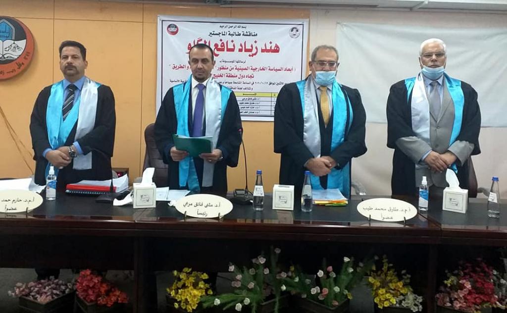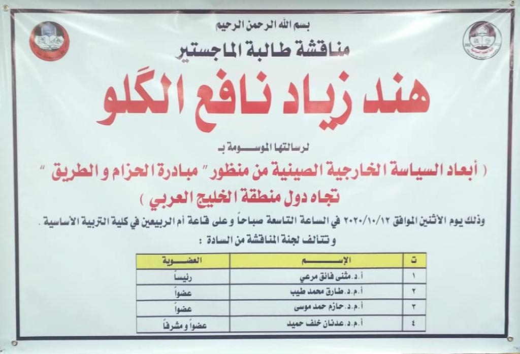 جرت صباح يوم الاثنين الموافق ١٢ / ١٠ / ٢٠٢٠ مناقشة رسالة الماجستير الموسومة (أبعاد السياسة الخارجية الصينية من منظور مبادرة الحزام والطريق تجاه دول منطقة الخليج العربي) للطالبة هند زياد نافع ، في قاعة ام الربيعين بالمجمع الجامعي الثاني ، وتألفت لجنة المناقشة من:١ – أ.د. مثنى فائق مرعي رئيسا.٢ – أ.م.د. طارق محمدطيب القصار عضوا.٣ – أ.م.د. حازم حمد موسى عضوا.٤ – أ.م.د. عدنان خلف حميد عضوا ومشرفا..وبعد مناقشة علمية مستفيضة اجيزت الرسالة لنيل درجة الماجستير في العلوم السياسية..