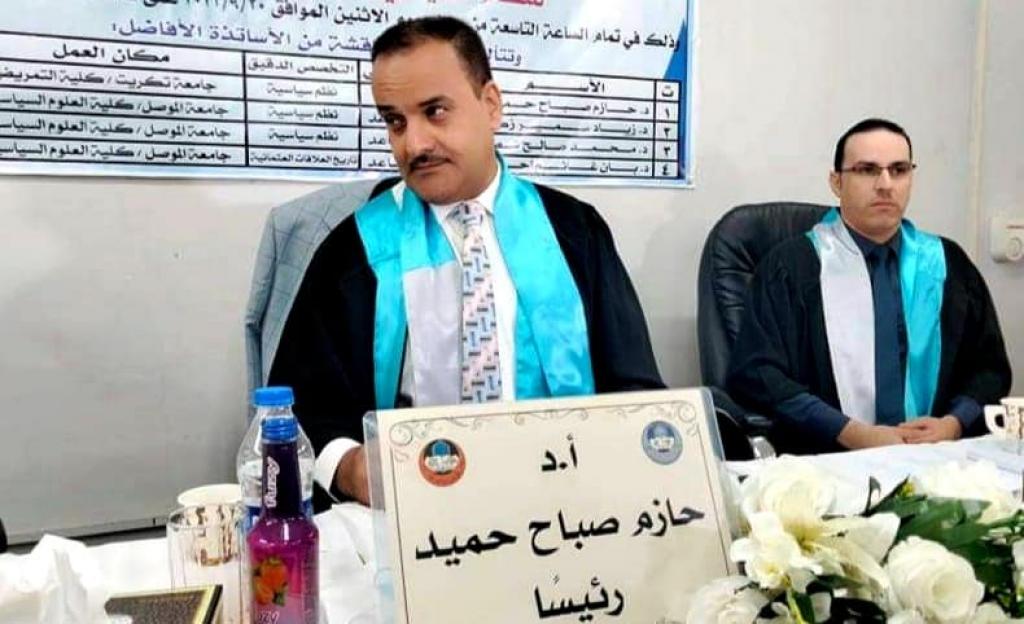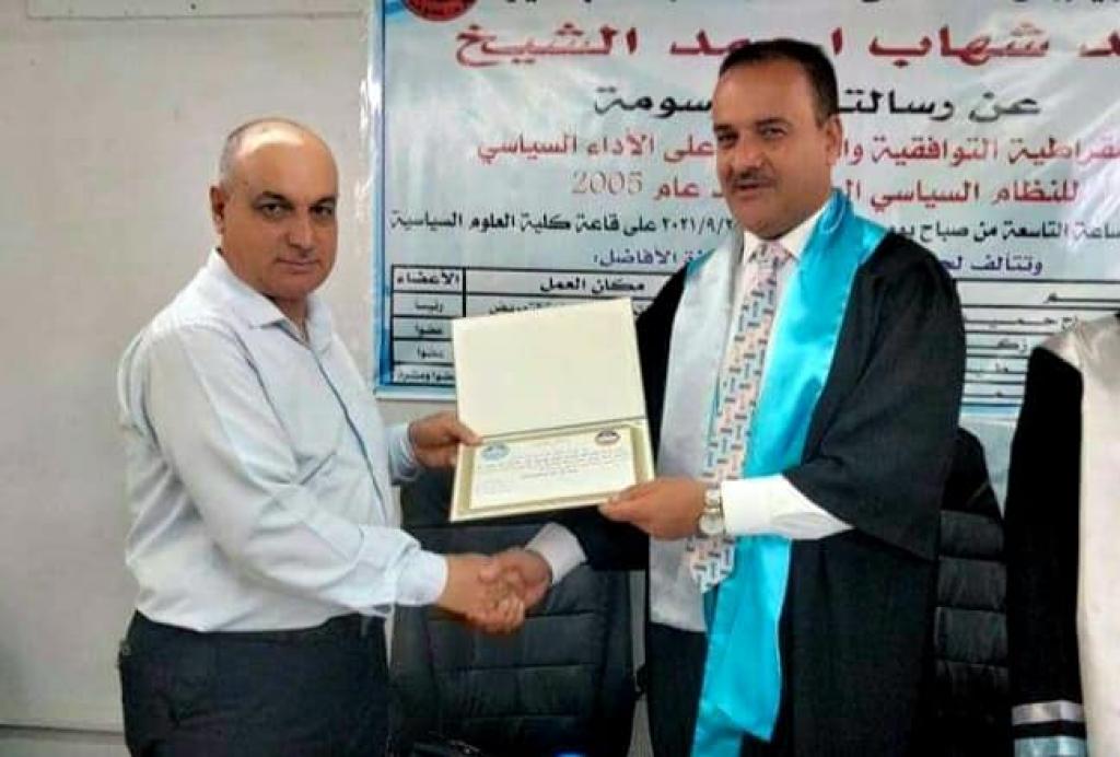ناقشت كلية العلوم السياسية بجامعة الموصل رسالة الماجستير الموسومة (الديمقراطية التوافقية وانعكاسها على الأداء السياسي للنظام السياسي العراقي بعد عام ٢٠٠٥) يوم الاثنين الموافق ٢٠ / ٩ / ٢٠٢١ للطالب سعد شهاب احمد الشيخ في قاعة المناقشات بكلية العلوم السياسية.وحضر جانبا منها الأستاذ المساعد الدكتور طارق محمد طيب القصار عميد الكلية وعدد من تدريسيي الكلية.موضوع الرسالة:تناولت الرسالة الديمقراطية التوافقية بوصفها موضوعاً حديث النشأة في الوطن العربي وفي العراق على وجه الخصوص.ويعدّ تنوع المجتمع العراقي فضلاً عن عامل الضغوط الخارجية من العوامل التي ساعدت على تبني هذا النموذج من الديمقراطيات، فالتوافقات السياسية التي تبنتها الكتل والاحزاب السياسية بعد التغيير الشامل للنظام السياسي العراقي عام ٢٠٠٣ وما تبعها من الدورات الانتخابية الأربعة بعد عام ٢٠٠٥ أصبحت عرفاً سياسياً متبعاً انعكس على الأداء السياسي في المؤسسات الرسمية وغير الرسمية.وتألفت لجنة المناقشة من السادة:١ – أ.د حازم صباح حميد رئيساً .٢ – أ.م.د زياد سمير زكي عضواً.٣ – أ.م محمد صالح شطيب عضواً.٤ – أ.م.د بان غانم احمد عضواً ومشرفاً .وبعد مناقشة علمية مستفيضة في محتوى الرسالة ودفاع الطالبة عنها اجيزت وأصبحت مؤهلة لنيل درجة الماجستير في العلوم السياسية.