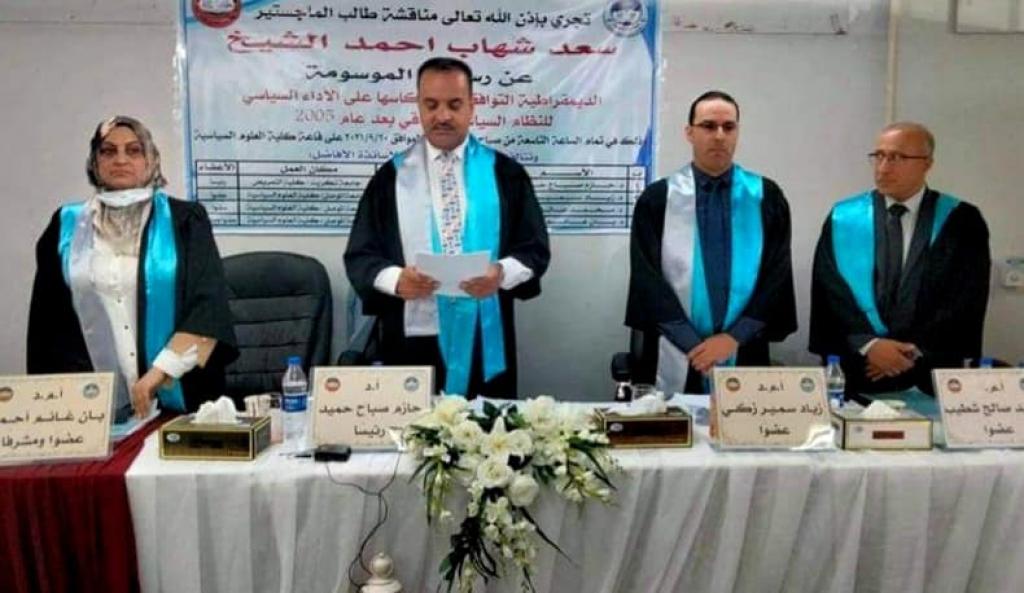 رسالة ماجستير في كلية العلوم السياسية تناقش (الديمقراطية التوافقية وانعكاسها على الأداء السياسي للنظام السياسي العراقي بعد عام ٢٠٠٥)