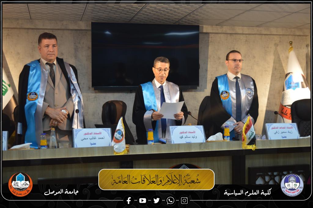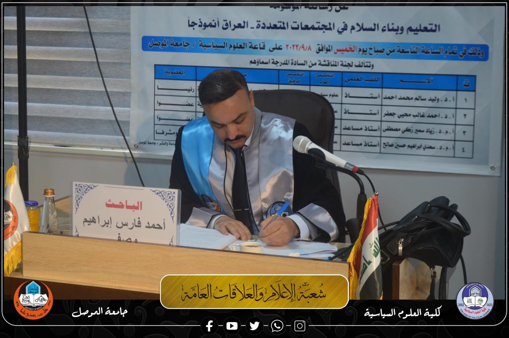 ناقشت كلية العلوم السياسية بجامعة الموصل رسالة ماجستير عن “التعليم وبناء السلام في المجتمعات المتعددة: العراق أنموذجاً”، يوم الخميس الموافق 8 أيلول 2022، في قاعة المناقشات في كلية الفنون الجميلة. حضر جانباً منها الاستاذ المساعد الدكتور طارق محمد طيب ظاهر عميد كلية العلوم السياسية وعدداً من السادة أعضاء الهيئة التدريسية.وجاءت الرسالة التي تقدم بها الطالب أحمد فارس إبراهيم وصفي لتسلط الضوء على ضرورة تحقيق ذاتية الأفراد والجماعات، عبر معالجة كل عوامل القلق التي تعتريهم داخل مجتمعهم التعددي؛ ولبلوغ ذلك يتطلب تحقيق مجتمع مدرك لأهمية التعايش السلمي، ومتصدي لأزماته الكثيرة سيما ازمة الاندماج وغياب الهوية الوطنية الجامعة، وخلق مجتمع مواطني يكون فيه الجميع متساوياً في الحقوق والواجبات بغض النظر عن قوميتهم او دينهم او مذهبهم، وضرورة ضمان عدالة اجتماعية للجميع، وبلورة إدراك لأهمية التطبيق الحقيقي للديمقراطية التي تكفل جميع ما ذكر من أُسس تحتاجها المجتمعات المتعددة لبناء السلام.وتهدف الدراسة الى لفت الأنظار نحو التعليم بوصفه أداة فعالة لبناء السلام. إذ أن التعليم يمثل الأداة الأكثر فعالية لبناء السلام وتنشئة أجيال واعية ومؤهلة، تبدي استعداداً نفسياً ومعرفياً لأهمية التعايش السلمي والمشاركة السياسية والاعتراف بالآخر وتقديم المصلحة العامة على الخاصة، فضلاً عن عدم الانجرار وراء التوظيف السياسي للتعدد والاختلاف المجتمعي.وقد ترأس لجنة المناقشة الاستاذ الدكتور وليد سالم محمد، وعضوية كل من الاستاذ الدكتور احمد غالب محيي، والاستاذ المساعد الدكتور زياد سمير زكي، وبإشراف وعضوية الأستاذ المساعد الدكتور سعدي إبراهيم حسين صالح.موقع كلية العلوم السياسية على الويب https://www.uomosul.edu.iq/ar/politicalScienceموقع كلية العلوم السياسية على منصة تويتر https://twitter.com/SciencesCollegeموقع كلية العلوم السياسية على منصة يوتيوبhttps://www.youtube.com/channel/UCm1S8mj-ObhfAKwBdLnU9MQ