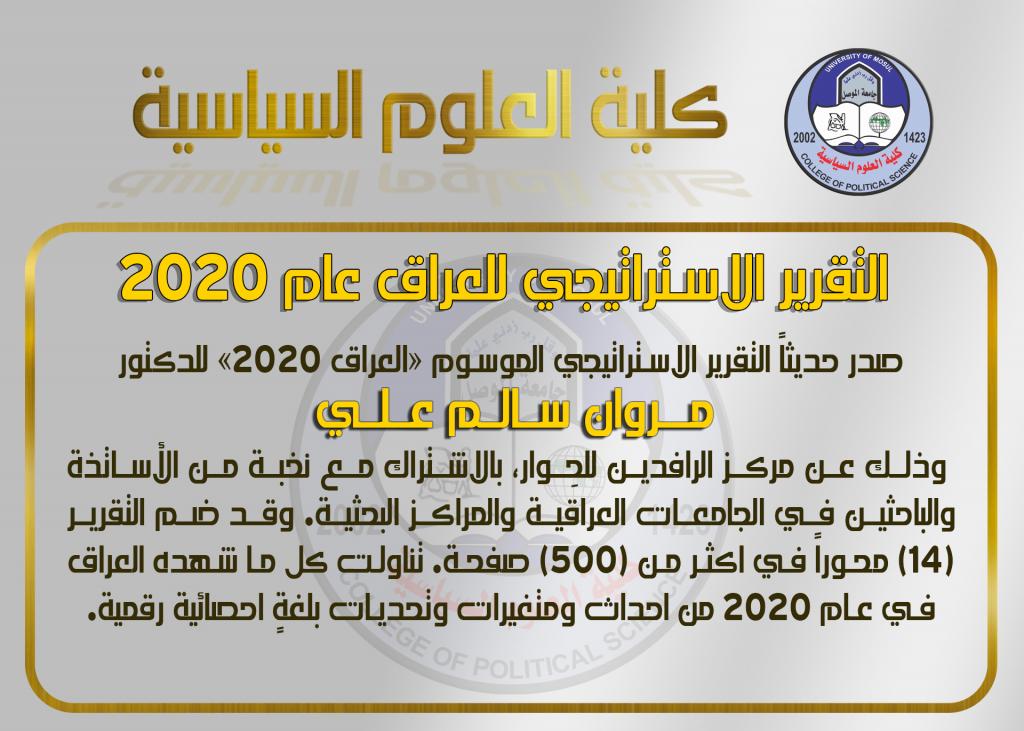 صدر حديثاً التقرير الاستراتيجي الموسوم: (العِراق 2020) للأَستاذ المُساعد الدكتور (مروان سالم علي)، وذلك عن مركز الرافدين للحِوار، بالاشتراك مع نُخبة مِن الأَستاذة والباحثين في الجامِعات العِراقية والمراكز البحثية.وضم التقرير (14) مِحوراً، جاءت بأكثر مِن (500) صفحة. أهتم التقرير بمحاورهُ المُتعددة بعرض كُل ما شهِدهُ العِراق في عام2020 مِن احداث ومُتغيرات وتحديات وعلى مُختلف الاصعدة بالأرقام والإِحصائيات، فضلاً عن تقديم رؤية مُستقبلية للعِراق في نهاية كُل مِحور مِن المحاور التي جاءت على النحو الآتي :المِحور الأَول : حصاد عام مِن الأَزماتالمِحور الثاني : جائحة كورونا.المِحور الثالث : العملية السياسية 2020المِحور الرابع : الاقتصاد العِراقي2020المِحور الخامس : الأَمن والدفاع في العِراق 2020المِحور السادس : علاقات العِراق الدولية 2020المِحور السابع : المُجتمع العِراقي 2020المِحور الثامن : المُجتمع المدنيالمِحور التاسع : التربية والتعليم العالي 2020المِحور العاشر : الخدمات العامةالمِحور الحادي عشر : مُكافحة الفسادالمِحور الثاني عشر : حقوق الإِنسان 2020المِحور الثالث عشر : المحور الإِعلامي 2020المِحور الرابع عشر : الزلازل في العِراق 2020..موقع كلية العلوم السياسية على الويب https://www.uomosul.edu.iq/ar/politicalScienceموقع كلية العلوم السياسية على منصة تويتر https://twitter.com/SciencesCollegeموقع كلية العلوم السياسية على منصة يوتيوبhttps://www.youtube.com/channel/UCm1S8mj-ObhfAKwBdLnU9MQ