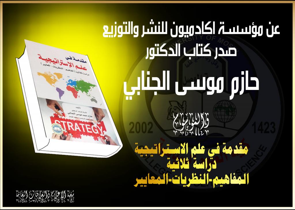 صدر حديثاً كتاب الاستاذ المساعد الدكتور حازم حمد موسى الجنابي الموسوم (مقدمة في علم الاستراتيجية: دراسة ثلاثية (المفاهيم -النظريات -المعايير) عن دار اكاديميون للنشر والتوزيع.اهتم الكتاب بعرض مفاهيم الدراسات الاستراتيجية التي اصلت علم الاستراتيجية، وركز الكتاب على نظريات الجيوبولتك والنظريات الجيو ايكونمك والنظريات الاستراتيجية الامنية والعسكرية ونظريات الاداء الاستراتيجي الدولي، وعرض الكتاب المعايير التي تقاس عليها قوة الدول؛ فكان الكتاب مهم للدارسين والباحثين والمختصين في حقل الدراسات الاستراتيجية.