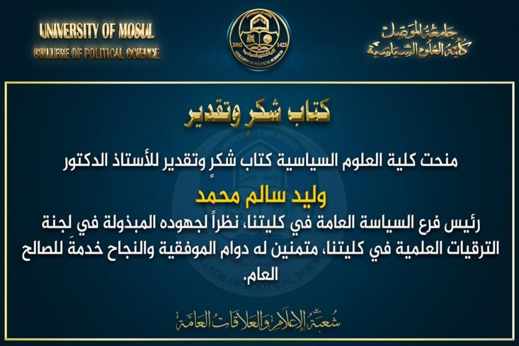 “عمادة الكلية تمنح كتاب شكرٍ وتقدير”……………………………منح الأستاذ المساعد الدكتور طارق محمد طيب ظاهر، عميد كلية العلوم السياسية، كتاب شكرٍ وتقدير للأستاذ الدكتور وليد سالم محمد، رئيس فرع السياسة العامة في كليتنا، لقاء مشاركته الفاعلة في لجنة الترقيات العلمية.