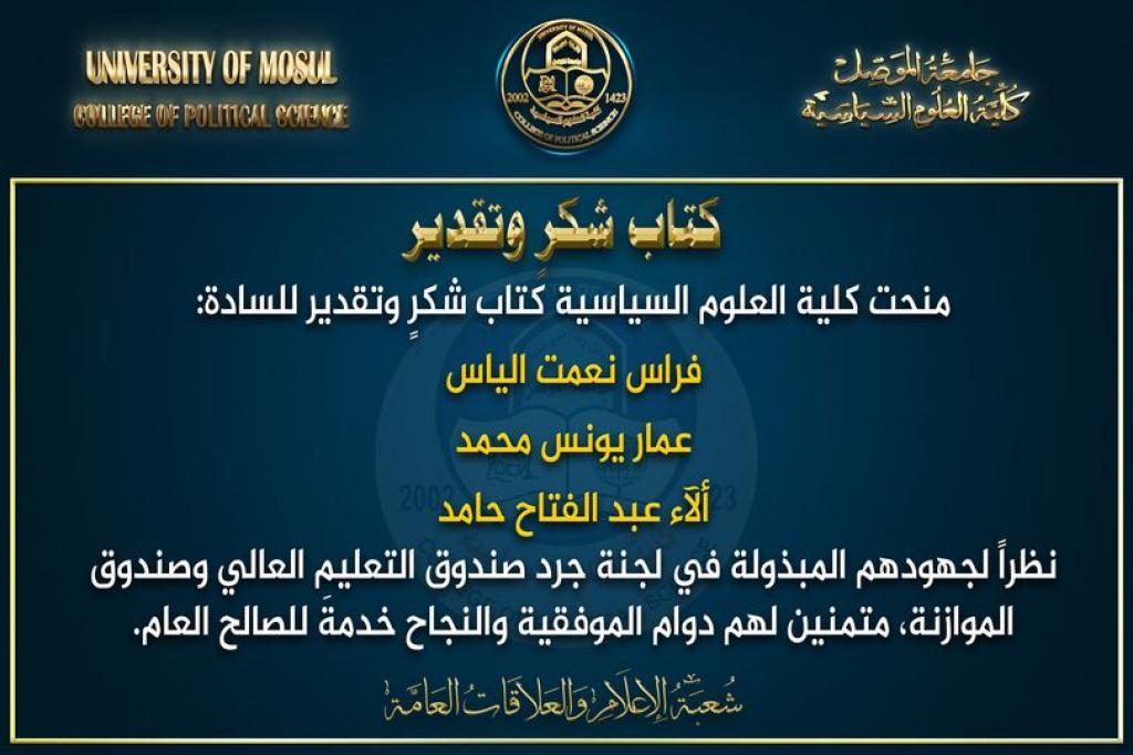 “عمادة الكلية تمنح كتاب شكرٍ وتقدير”……………………………منح الأستاذ المساعد الدكتور طارق محمد طيب ظاهر، عميد كلية العلوم السياسية، كتاب شكرٍ وتقدير للسادة المدرجة أسمائهم ادناه:السيد فراس نعمت الياسالسيد عمار يونس محمدالسيدة ألاء عبد الفتاح حامدلقاء مشاركتهم الفاعلة في لجنة جرد صندوق التعليم العالي وصندوق الموازنة.
