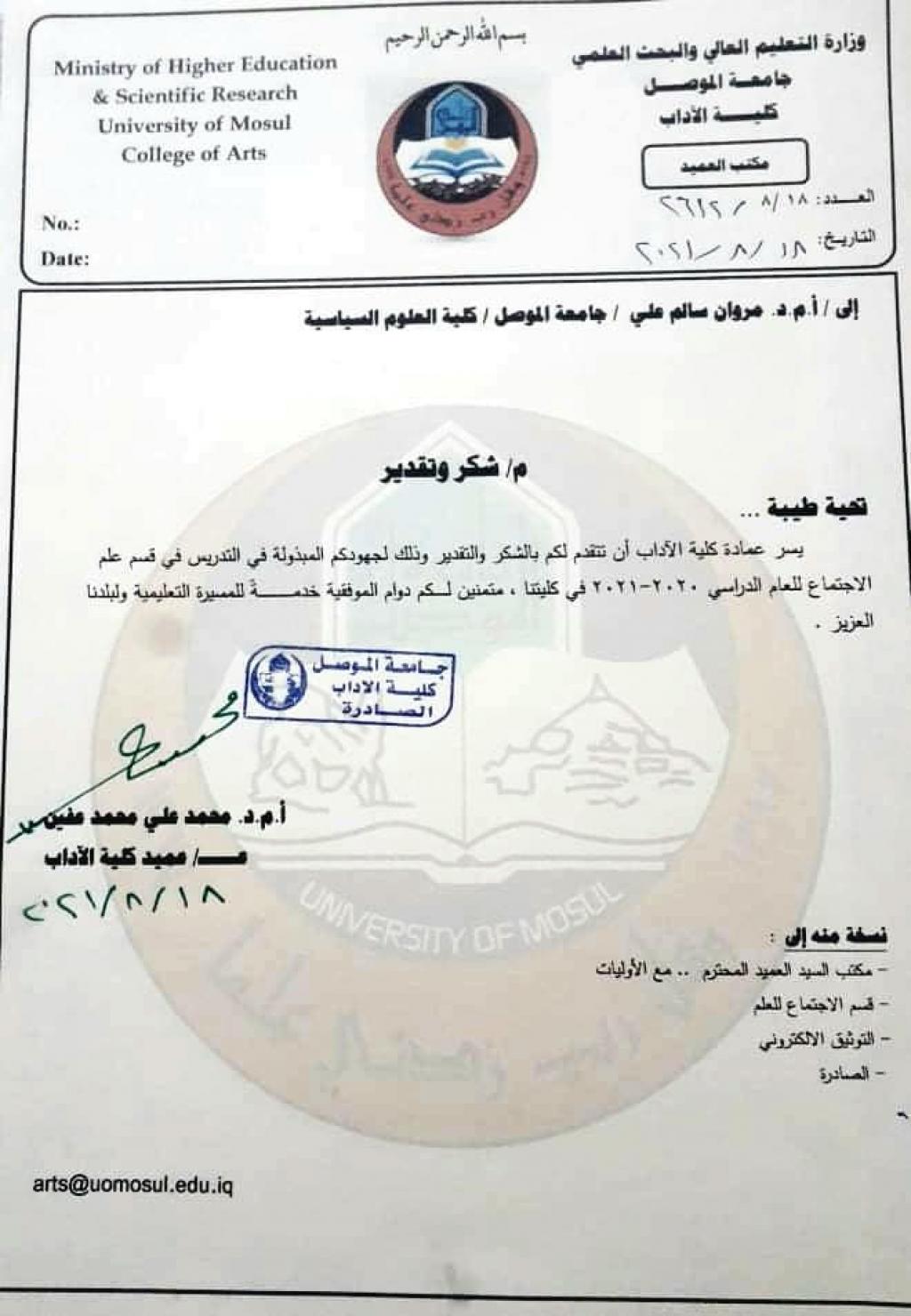 عمادة كلية الآداب بجامعتنا تتثمن جهود الدكتور وليد سالم محمد التدريسي في كلية العلوم السياسية