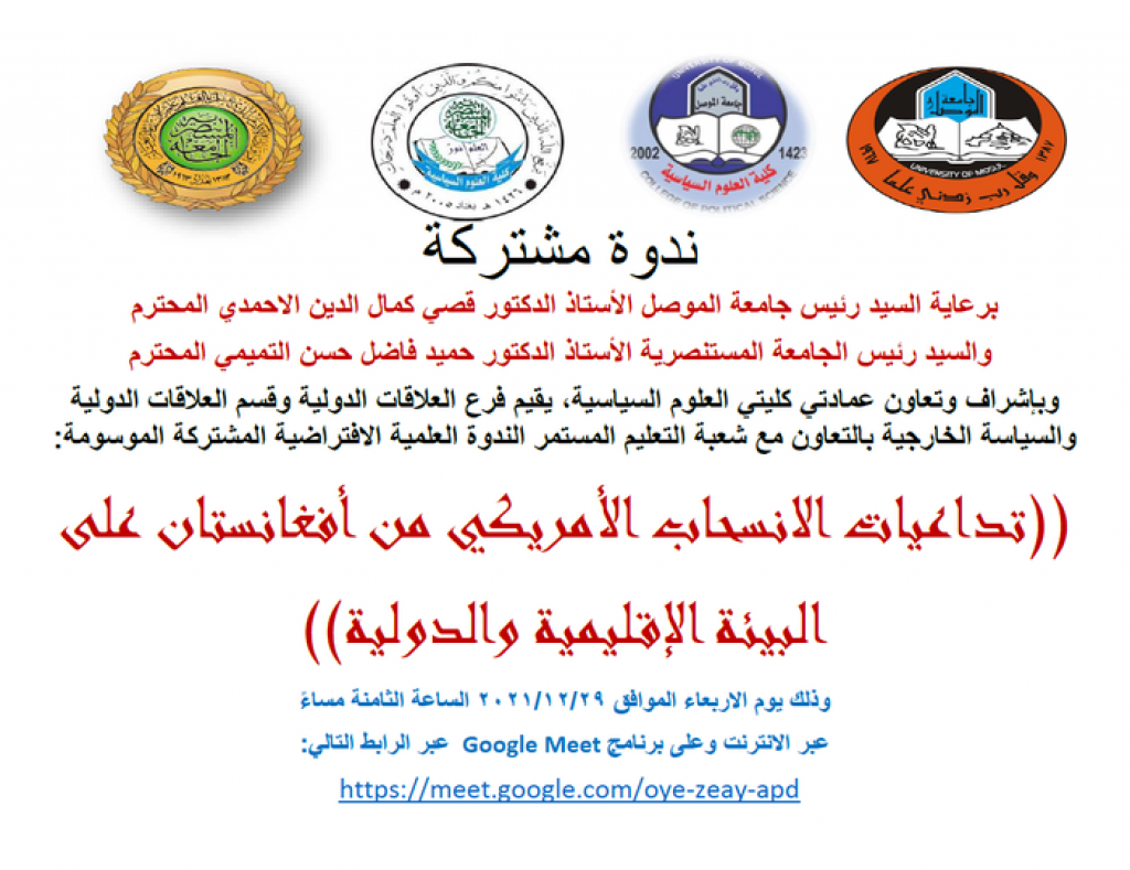 برعاية السيد رئيس جامعة الموصل الأستاذ الدكتور قصي كمال الدين الاحمدي، والسيد رئيس جامعة المستنصرية الأستاذ الدكتور حميد فاضل التميمي، وبحضور عمدي كليتي العلوم السياسية في جامعة الموصل وجامعة المستنصرية، انطلقت فعاليات الندوة العلمية المشتركة، التي اقامها فرع العلاقات الدولية في كليتنا وقسم العلاقات الدولية والسياسة الخارجية في كلية العلوم السياسية في جامعة المستنصرية، والموسومة:”تداعيات الانسحاب الامريكي من افغانستان على البيئة الاقليمية والدولية”، عبر برنامج Google Meet مساء يوم الاربعاء الموافق 2021/12/29.وقد شارك في هذه الندوة العديد من الاستاذة والباحثين من جامعة الموصل وجامعة المستنصرية، الذين سلطوا الاضواء على العديد من القضايا المتعلقة بالاثار المترتبة على الفرغ الجيوستراتيجي الذي احدثه الانسحاب العسكري الامريكي من افغانستان، والتغيرات التي طرات على طبيعة التنافس السياسي والاقتصادي في اواسط اسيا ومدى استقرار البيئة الاقليمة والدولية، فضلاً عن دور الفواعل الرئيسة والثانوية المتأرجحة بين البحث عن المكاسب والفرص وتجنب الكوابح والمخاطر.موقع كلية العلوم السياسية على الويب https://www.uomosul.edu.iq/ar/politicalScienceموقع كلية العلوم السياسية على منصة تويتر https://twitter.com/SciencesCollegeموقع كلية العلوم السياسية على منصة يوتيوبhttps://www.youtube.com/channel/UCm1S8mj-ObhfAKwBdLnU9MQ