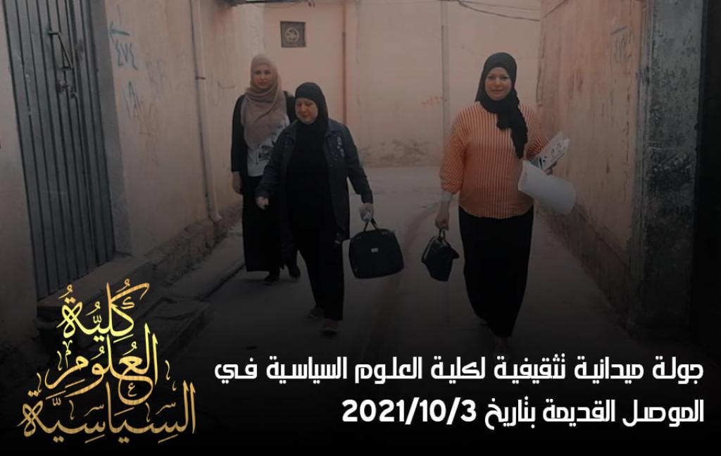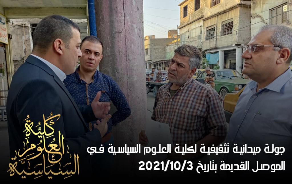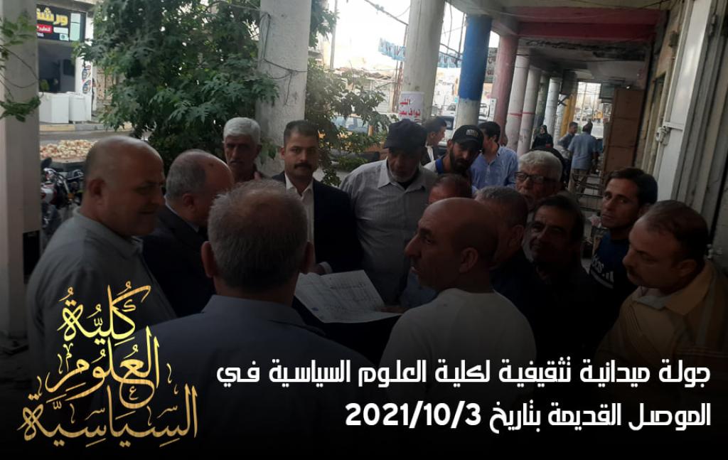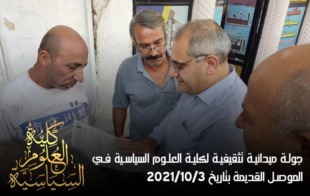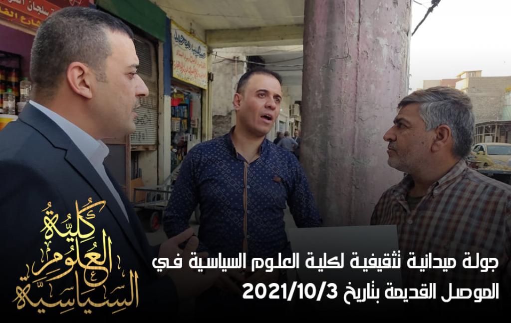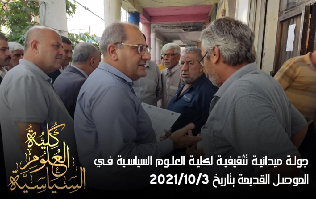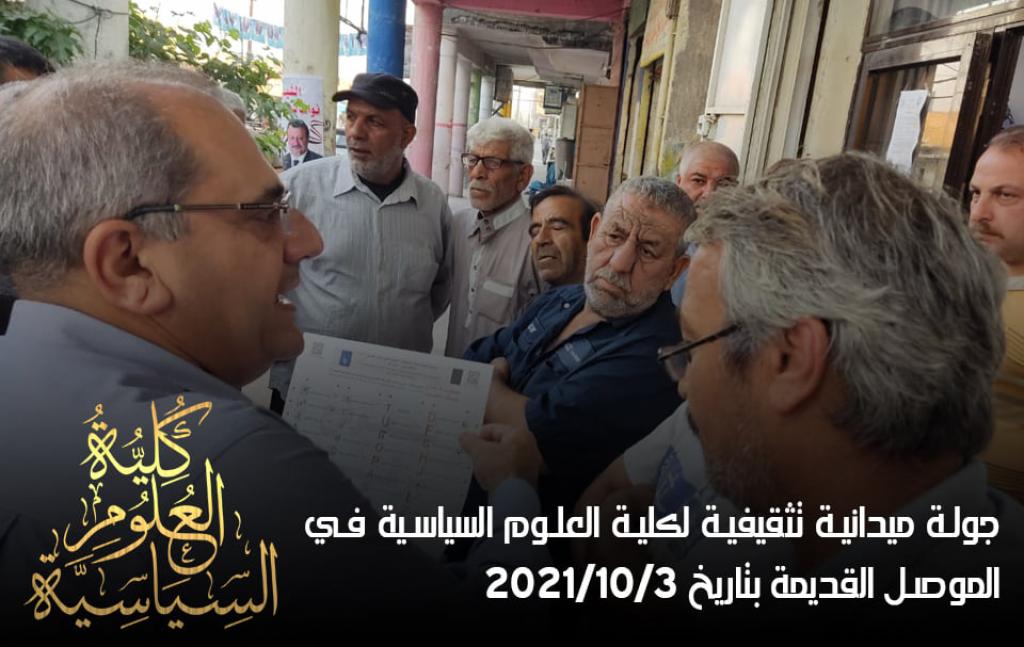 ضمن إطار برنامج التعاون بين كلية العلوم السياسية والمفوضية العليا المستقلة للإنتخابات / مكتب نينوى .قام فريق من الكلية وبالتعاون مع مفوضية الانتخابات بجولة تثقيفية ميدانية شملت عدداً من احياء الموصل القديمة في منطقة حمام المنقوشة وحضيرة السادة و باب البيض، حول مدى اهمية المشاركة في انتخابات اعضاء مجلس النواب العراقي المزمع اجراؤها بتاريخ 10/10 من العام الجاري. والتعريف بماهية العملية الانتخابية وكيفية التصويت ..
