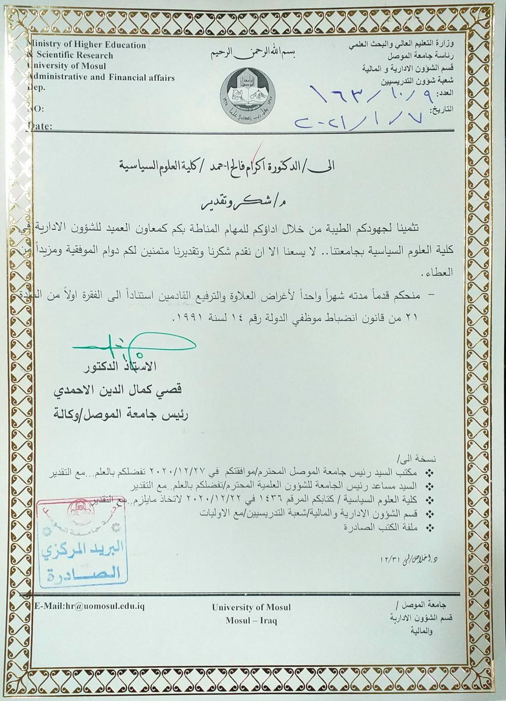 كتاب شكر وتقدير من السيد رئيس الجامعة للدكتورة إكرام فالح أحمد معاون العميد للشؤون الإدارية والمالية في كليتنا