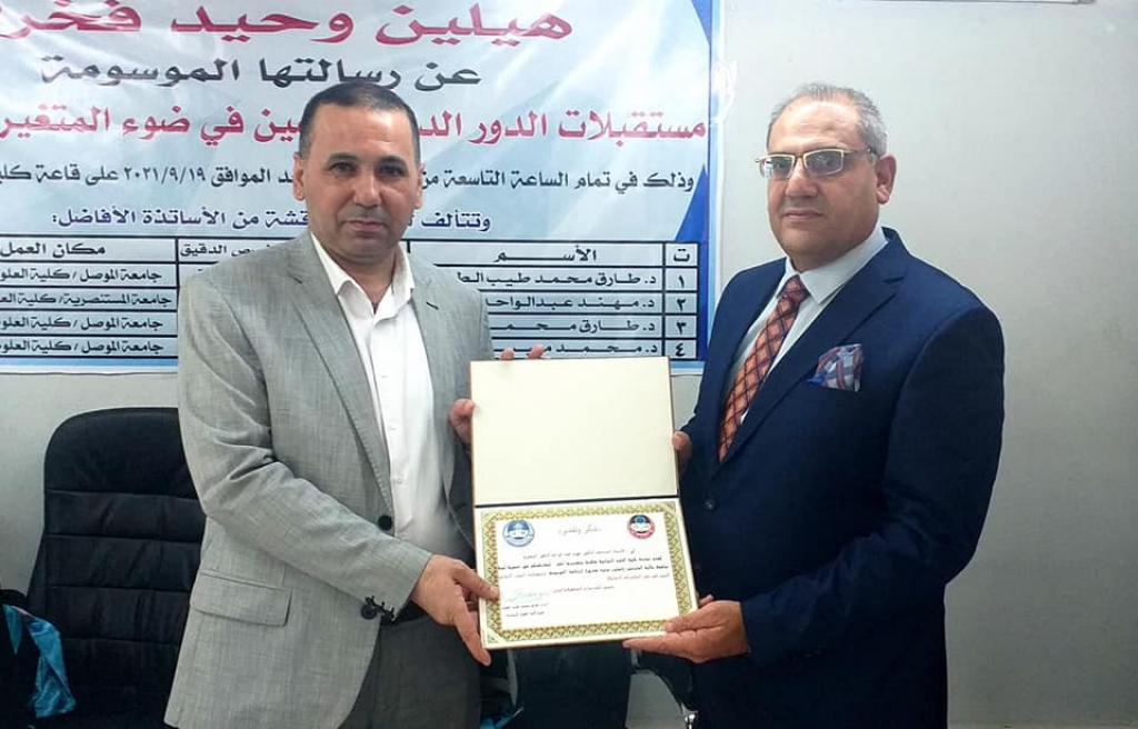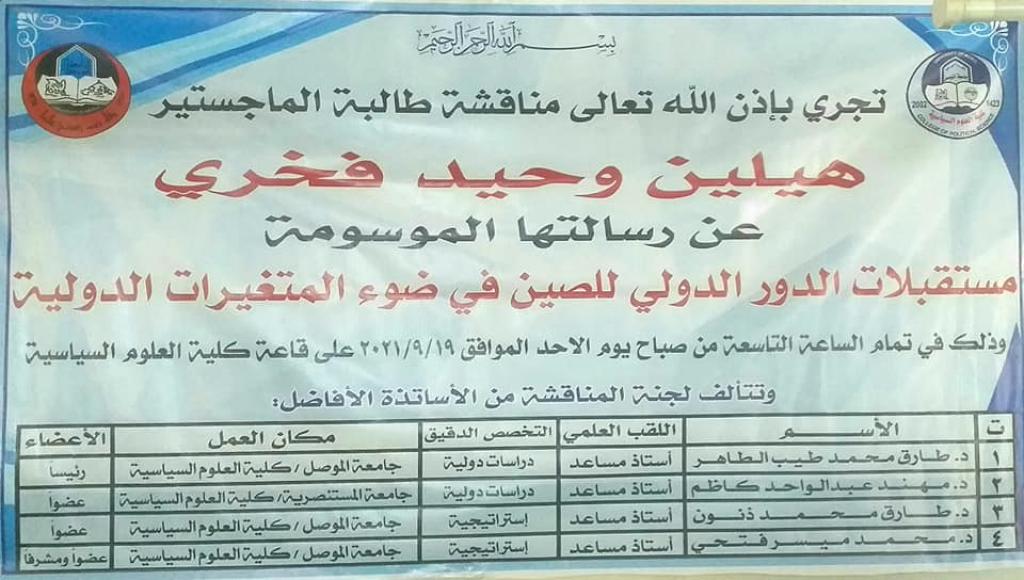 إستمراراً لسلسلة مناقشات طلبة الماجستير، ناقشت كلية العلوم السياسية بجامعة الموصل رسالة الماجستير الموسومة (مستقبلات الدور الدولي للصين في ضوء المتغيرات الدولية) يوم الأحد الموافق ١٩ / ٩ / ٢٠٢١ للطالبة هيلين وحيد فخري في قاعة المناقشات بكلية العلوم السياسية.وحضر جانبا منها عدد من تدريسيي الكلية.وبدأت المناقشة بقراءة سورة الفاتحة على روح المرحوم الأستاذ المساعد الدكتور محمد وائل عبدالرحمن الذي كان مشرفاً على الطالبة قبل أن توافيه المنية اثر إصابته بفايروس كورونا ..موضوع الرسالة:إن الصين أمام مشاهد مستقبلية عدة عام ٢٠٣٠، وتلك المشاهد المستقبلية مرتهنة بالمتغيرات الدولية من جانب، ونجاح مشاريعها الاستراتيجية العالمية من جانب آخر، بالتزامن مع تصدع بعض جوانب القوة لدى القوى الدولية الأخرى.وتألفت لجنة المناقشة من السادة:١ – أ.م.د طارق محمد طيب القصار رئيساً .٢ – أ.م.د مهند عبدالواحد كاظم عضواً .٣ – ا.م.د طارق محمد ذنون عضواً .٤ – أ.م.د محمد ميسر فتحي عضواً ومشرفاً .وبعد مناقشة علمية مستفيضة في محتوى الرسالة ودفاع الطالبة عنها اجيزت وأصبحت مؤهلة لنيل درجة الماجستير في العلوم السياسية.