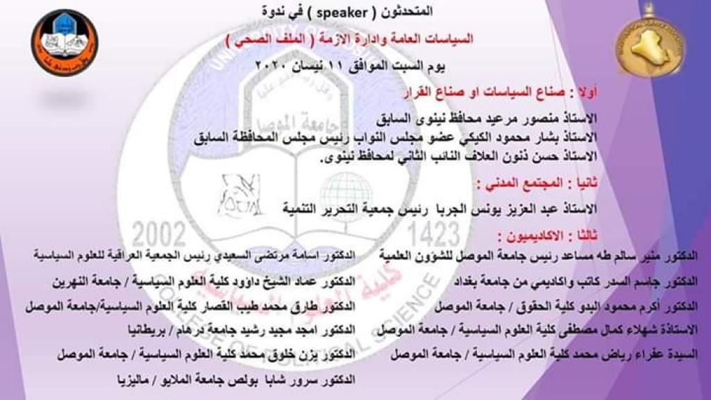 كلية العلوم السياسية تعقد ندوتها العلمية الموسومة ” السياسات العامة وإدارة الأزمات – الملف الصحي”