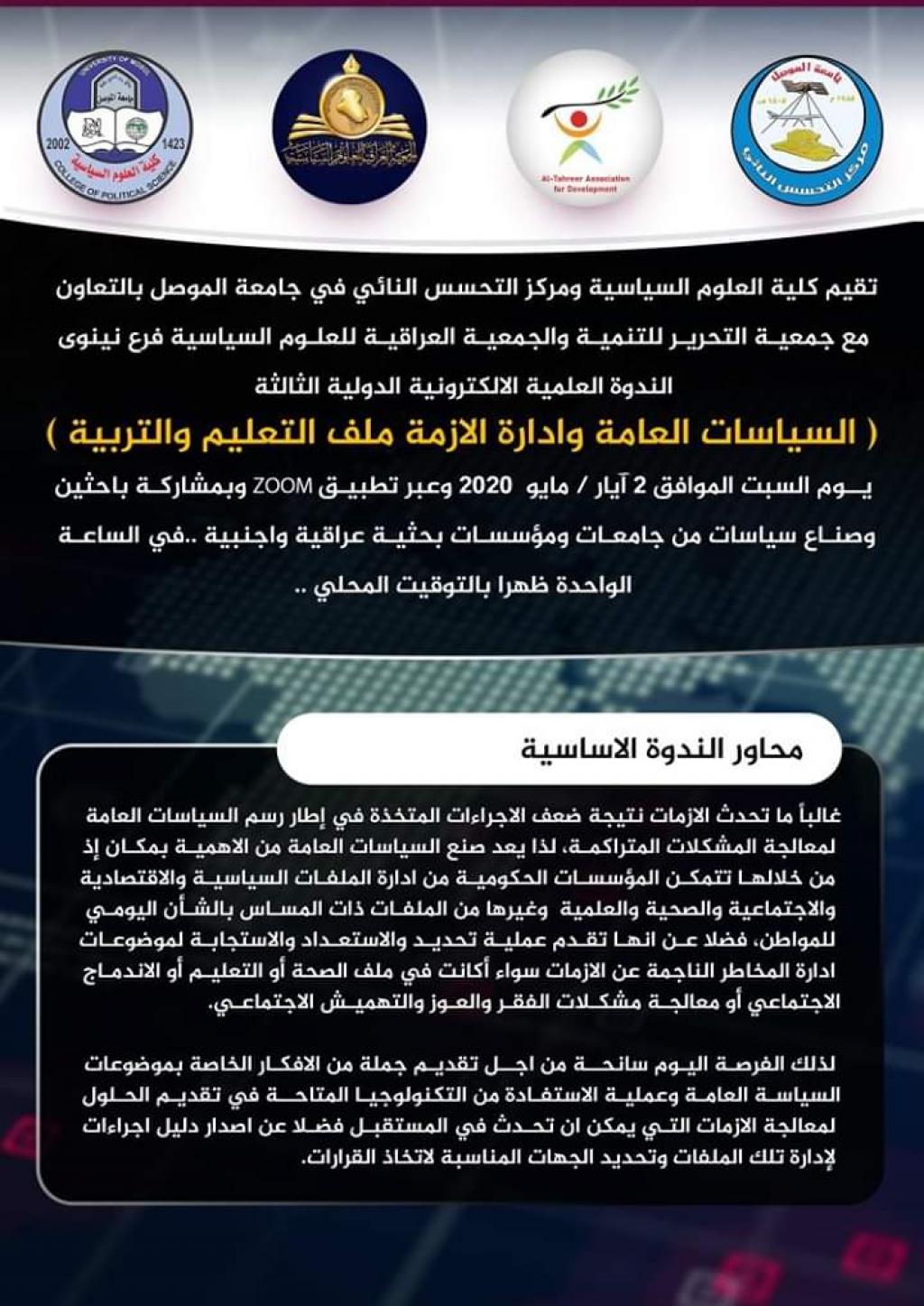 ضمن سلسلة ندواتها العلمية تقيم كلية العلوم السياسية ومركز التحسس النائي / جامعة الموصل وبالتعاون مع جمعية التحرير والتنمية والجمعية العراقية للعلوم السياسية / فرع نينوى الندوة العلمية الدولية الإلكترونية الموسومة (السياسات العامة وادارة الازمة – ملف التعليم والتربية) اليوم السبت الموافق 2020/5/2 الساعة الواحدة ظهرا وذلك عبر برنامج zoom cloud meeting ويمكن الدخول الى الندوة عبر الرابط المباشر: