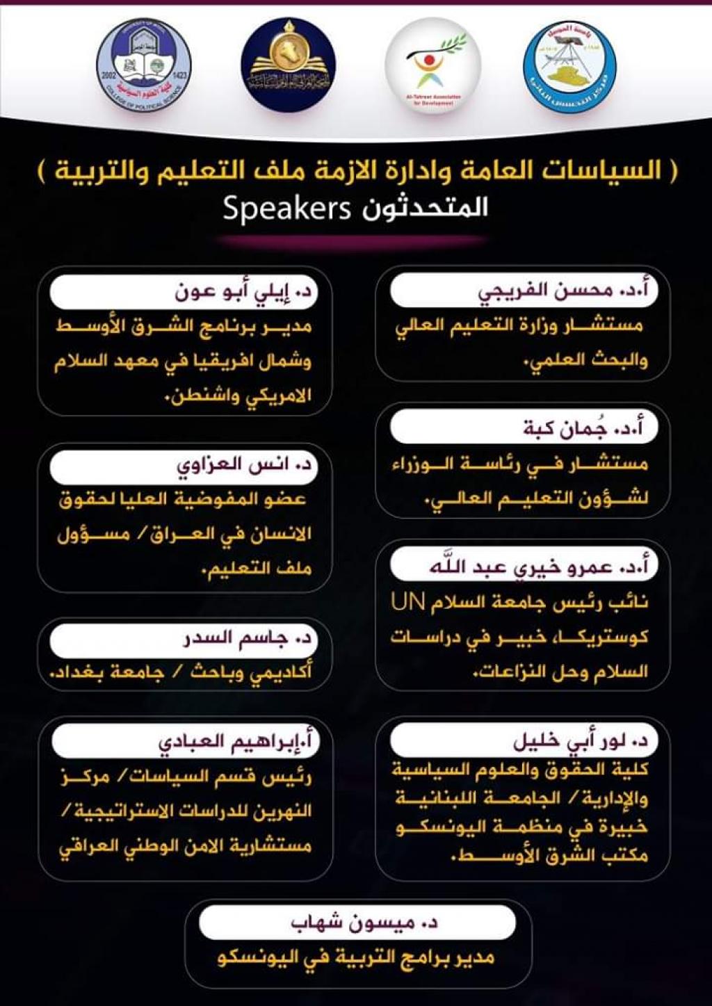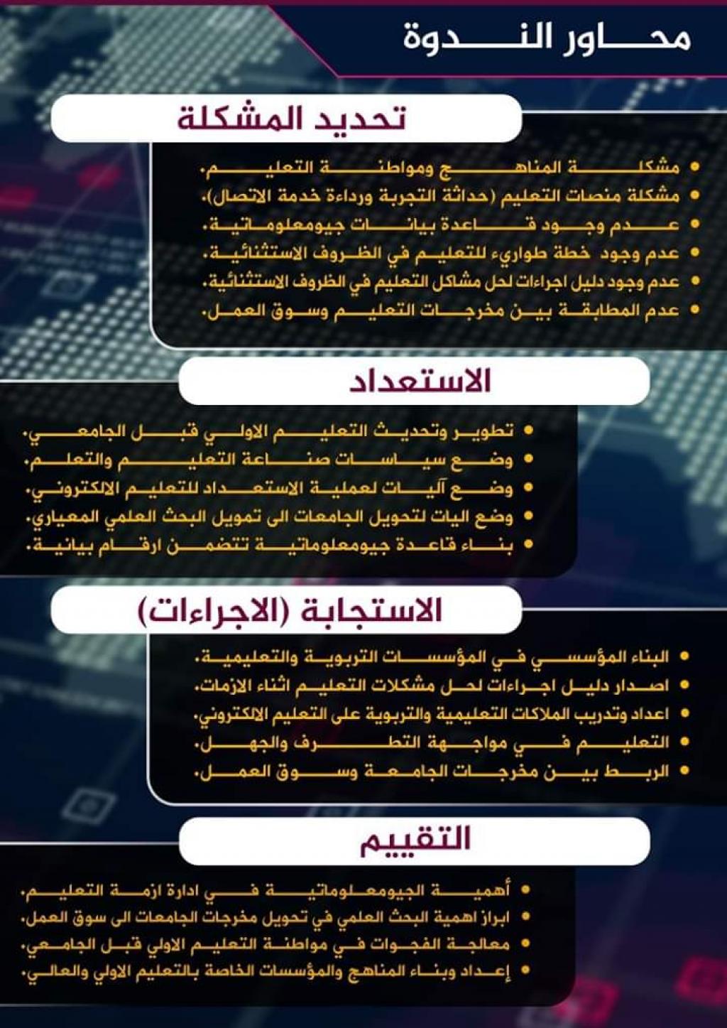 كلية العلوم السياسية بالتعاون مع مركز التحسس النائي تنظم الندوة العلمية الدولية الإلكترونية الموسومة (السياسات العامة وإدارة الأزمة / ملف التعليم والتربية)