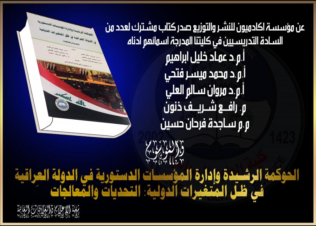 ضمن نشاطاتها العلمية السنوية المُستمرة، مجموعة مِن أَساتذة كُلية العلوم السياسية يقومون بتأليف كِتاب علمي مُشترك، حمل عنوان (الحوكمة الرشيدة وإدارة المؤسسات الدستورية في الدولة العِراقية في ظل المُتغيرات الدولية: التحديات والمُعالجات). وتم تأليف الكتاب مِن قِبل:1. أ.م.د. عِماد خليل إِبراهيم2. أ.م.د. محمد ميسر فتحي3. أ.م.د. مروان سالم العلي4. م. رافع شريف ذنون5. م.م. ساجِدة فرحان حسينوجاء هذا الكِتاب للفت انتباه صُناع القرار حول ماهية الحوكمة الرشيدة ومُبررات ظهورها ومؤشراتها المُختلِفة، ناهيك عن دورها في إِدارة المؤسسات الدستورية في بِناء الدولة العِراقية في ظل المُتغيرات الدولية، مع تسليط الضوء على أهم تحديات تطبيقها، ومِن ثُم الإِشارة إلى أهم المُعالجات الكفيلة بتعزيزها ودورها في تحقيق التنمية المُستدامة وفي مُكافحة الفساد الإِداري والمالي، وكذلك التعرُف على المسارات العديدة للحوكمة ومِن أَهمها، مسار الإِصلاحات الاقتصادية؛ المُتمثلة في تحديث القطاع العام، والشراكة بين القطاعين العام والخاص، وتبني نهج الحوكمة الالكترونية. ومسار النفاذ إِلى العدالة؛ أَي الدستور وحقوق الإِنسان والقضاء الصالح، ومسار الإِصلاح المؤسساتي، وأَخيراً مسار إِشاعة ثقافة حقوق الإِنسان وتطبيق النزاهة والشفافية في الوظيفة العامة، وتقوية الرقابة والمُساءلة في اداء الخدمات العامة.تُشكل البحوث والدِراسات التي يحتويها الكِتاب، معيناً يثري النِقاش ويُعزز الحِوار الموضوعي حول مُختلف القضايا والتحديات التي تواجه وتُعيق تطبيق الحوكمة الرشيدة في مؤسسات الدولة العِراقية في ظل المُتغيرات الدولية، وسُبل ومُقترحات تطبيقها في هذه المرحلة المُهِمة مِن مراحل تاريخ العِراق.