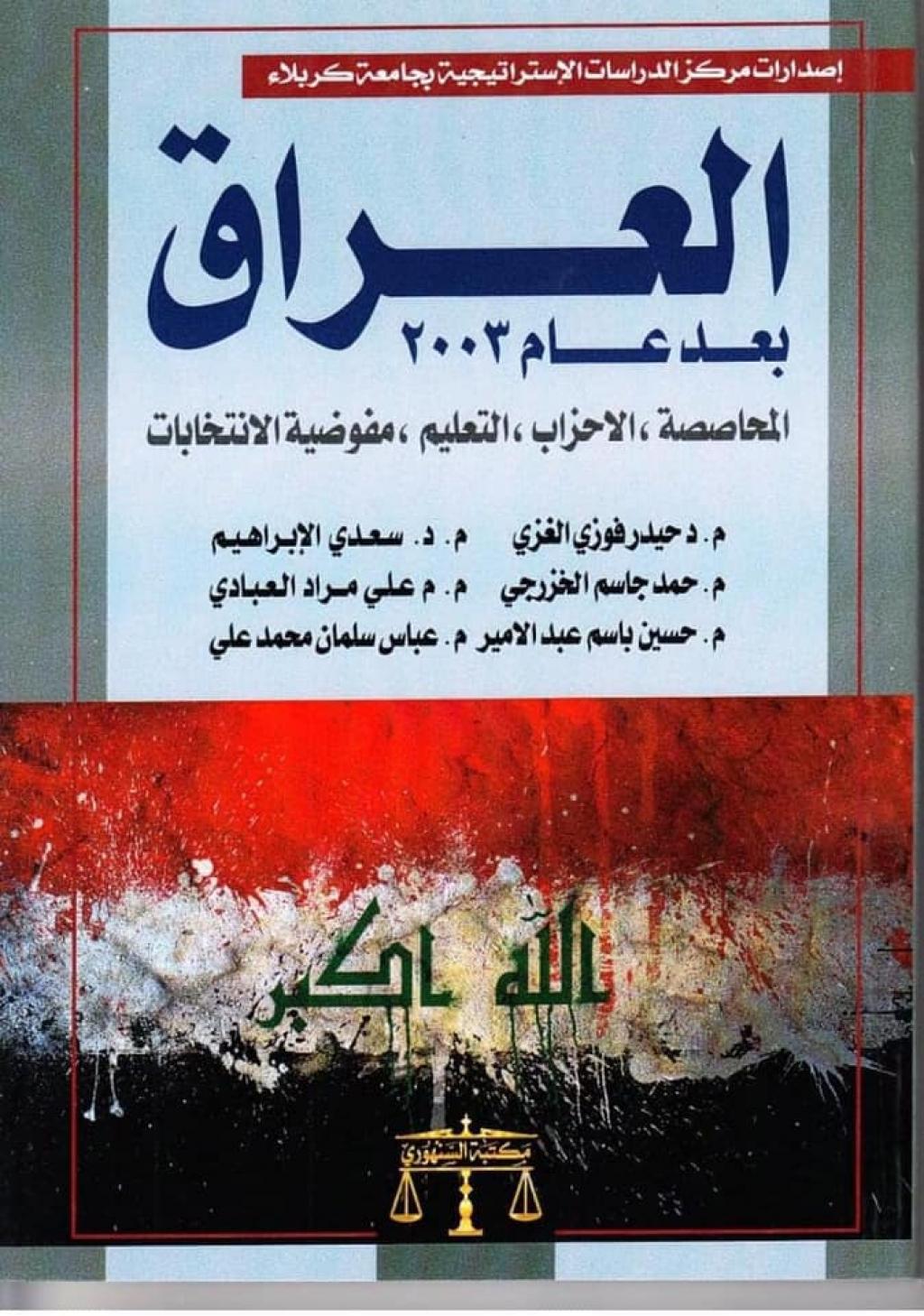 صدر للدكتور سعدي الابراهيم التدريسي في فرع السياسة العامة وبالتعاون مع نخبة من الباحثين في مركز الدراسات الاستراتيجية في جامعة كربلاء، كتاب جديد بعنوان ((العراق بعد عام 2003)) … الكتاب من إصدارات مركز الدراسات الاستراتيجية بجامعة كربلاء، ويعد هذا الكتاب من الانجازات العلمية المهمة، كونه حصيلة جهد جماعي، ويتضمن وجهات نظر متعددة، ويتناول بالبحث والتفسير والتحليل جملة من الملفات الاستراتيجية التي تقف في طريق بلادنا الطويل نحو التنمية والاستقرار والعدالة الاجتماعية.