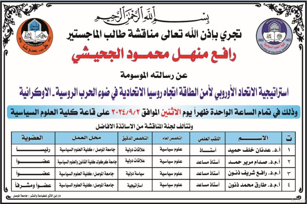 كل الأمنيات والتوفيق لكليتنا وجامعتنا بعام دراسي مفعم بالخير والعطاء خدمةً للموصل والعراق بإذنه تعالى.