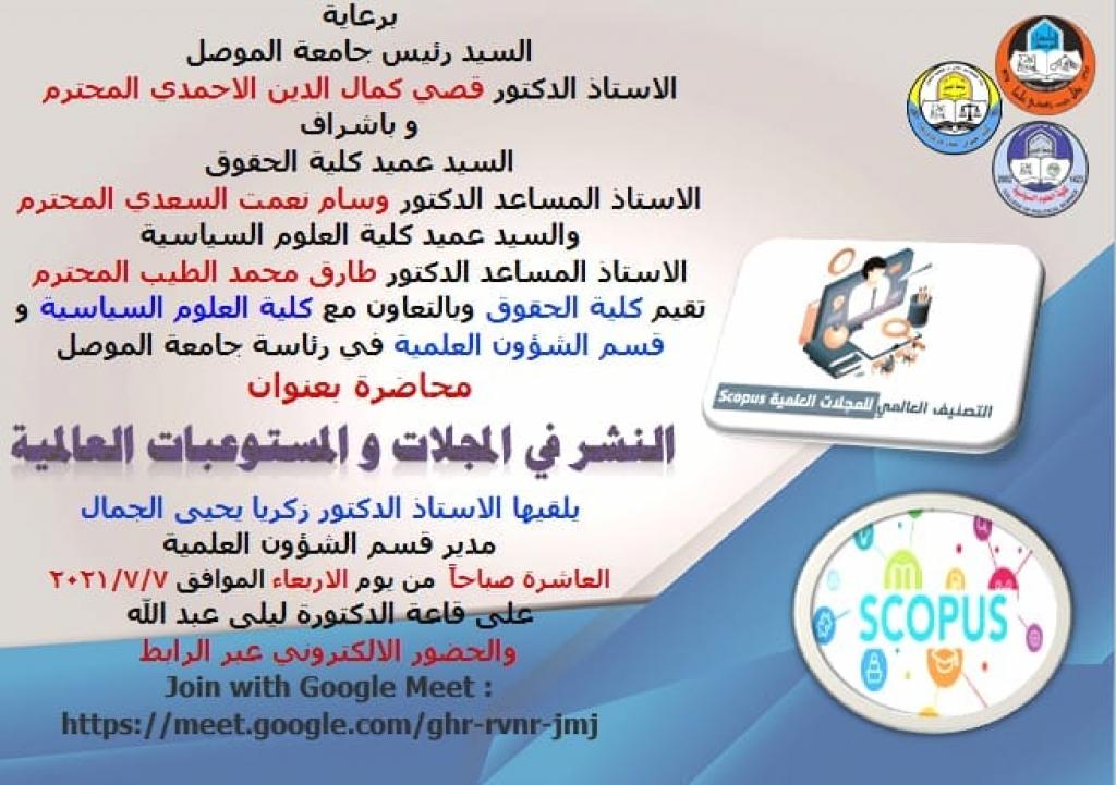 برعاية السيد رئيس جامعة الموصل الأستاذ الدكتور قصي كمال الدين الأحمدي وإشراف السيد عميد كلية الحقوق الأستاذ المساعد الدكتور وسام نعمت السعدي والسيد عميد كلية العلوم السياسية الأستاذ المساعد الدكتور طارق محمد طيب القصار ..تقيم كلية الحقوق بالتعاون مع كلية العلوم السياسية وقسم الشؤون العلمية في رئاسة جامعة الموصل محاضرة بعنوان (النشر في المجلات والمستوعبات العالمية) يلقيها الأستاذ الدكتور زكريا يحيى الجمَّال مدير قسم الشؤون العلمية ، يوم الأربعاء الموافق ٧ / ٧ / ٢٠٢١ في الساعة العاشرة صباحاً في قاعة الدكتورة ليلى عبدالله ..كما سيكون هناك حضور الكتروني على الرابط المرفق في الإعلان ..