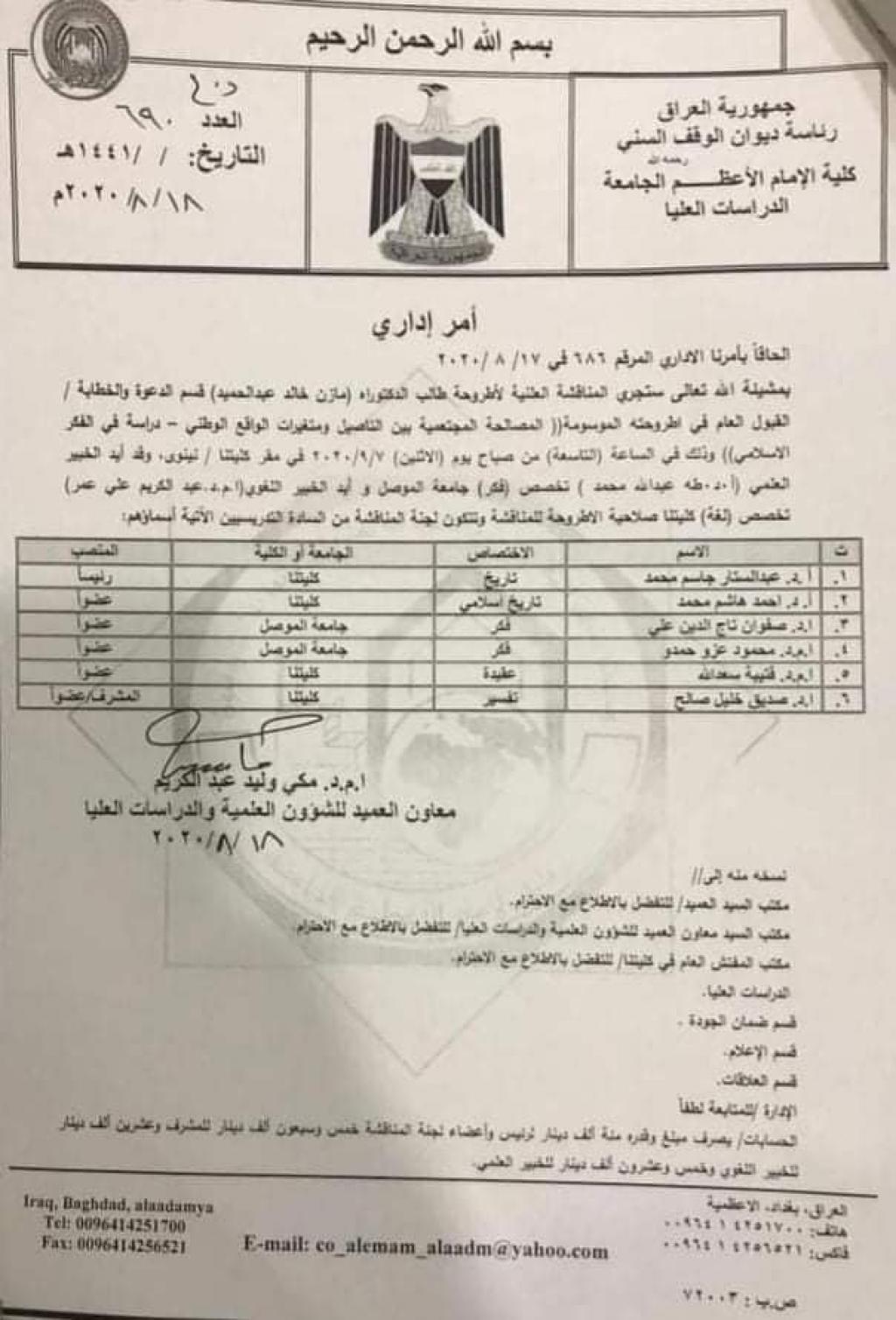 مشاركة الأستاذ المساعد الدكتور (محمود عزو حمدو) بمناقشة أطروحة دكتوراه في كلية الإمام الأعظم الجامعة