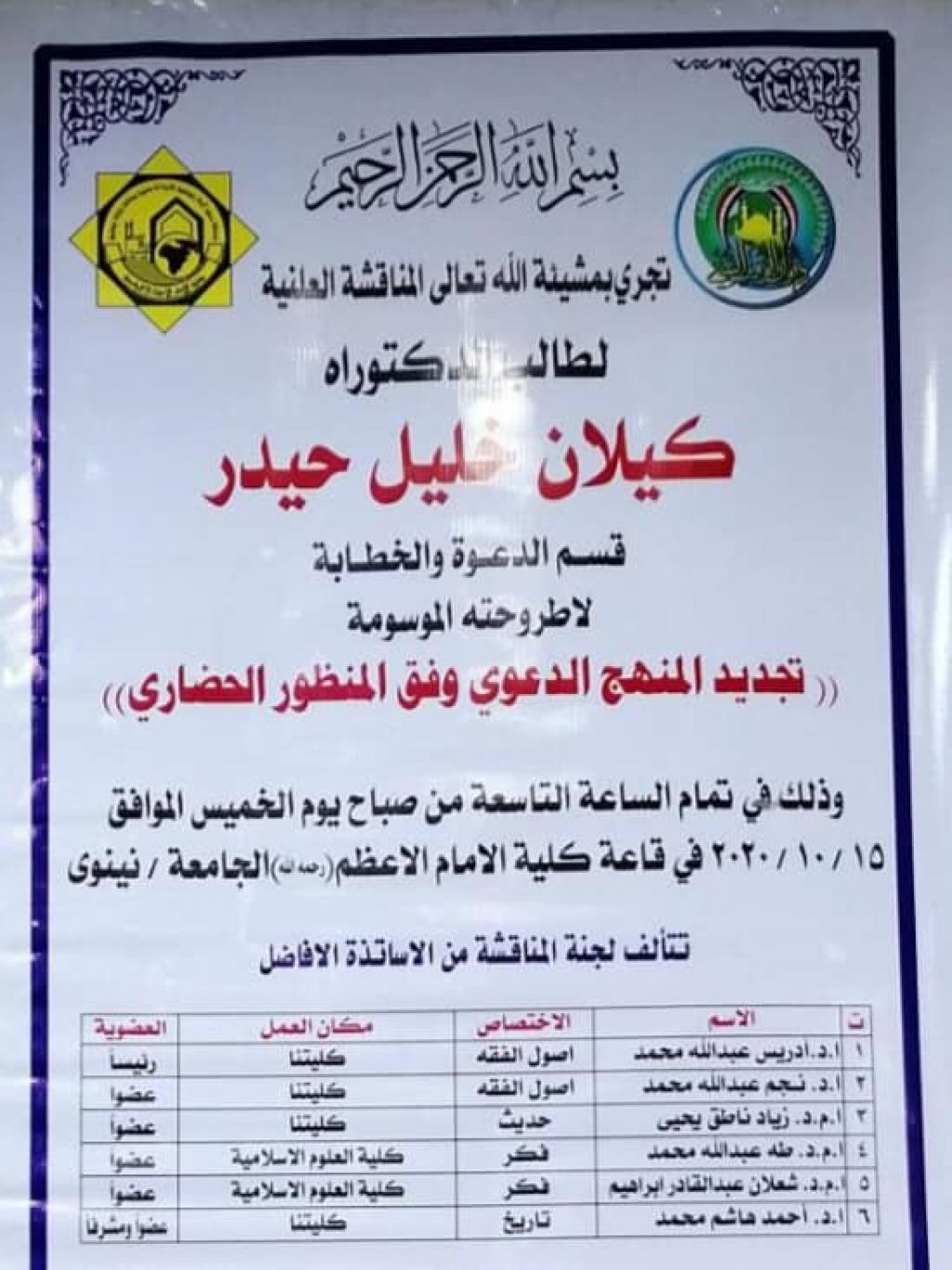 شارك الاستاذ المساعد الدكتور شعلان عبدالقادر ابراهيم التدريسي في فرع السياسية العامة بكليتنا في مناقشة أطروحة طالب الدكتوراه كيلان خليل حيدر الموسومة (تجديد المنهج الدعوي وفق المنظور الحضاري) يوم الخميس الموافق ٢٠٢٠/١٠/١٥ في كلية الإمام الأعظم (رحمه الله) الجامعة / نينوى.