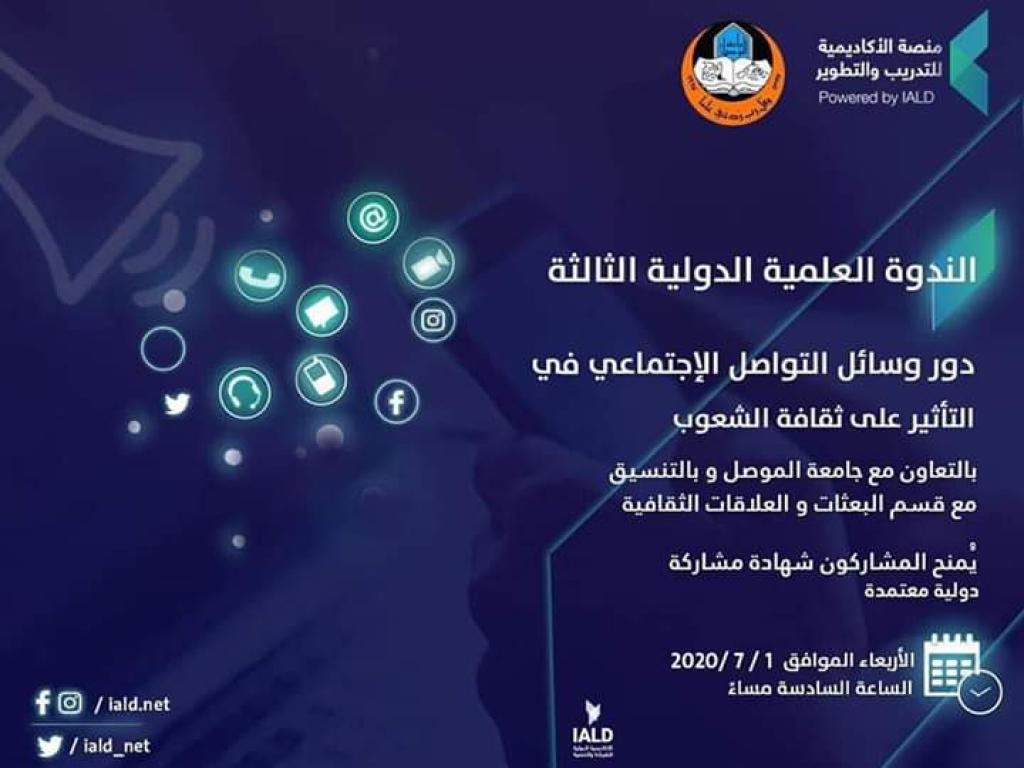 شارك السيد خيرالله سبهان عبدالله التدريسي في فرع السياسة العامة بكليتنا بالندوة التي أقامها قسم البعثات والعلاقات الثقافية بجامعة الموصل بالتعاون مع الأكاديمية الدولية للقيادة والتنمية بعنوان (دور وسائل التواصل الاجتماعي في التأثير على ثقافة الشعوب) مساء يوم الأربعاء الموافق ١ تموز ٢٠٢٠ …وجاءت مشاركة الاستاذ خيرالله ببحثه المعنون (مستقبل الثقافة في ظل هيمنة مواقع التواصل الاجتماعي).