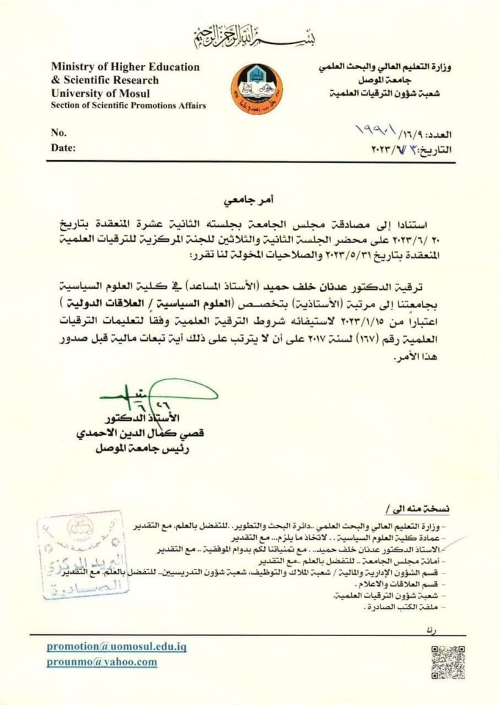 شارك الأستاذ المساعد الدكتور طارق محمد طيب القصار يوم الثلاثاء الموافق 11 تموز 2023 وعلى قاعة مديرية الوقف السني في نينوى في الملتقى الشهري للائمة والخطباء وتحت شعار “الإساءة الى القران إرهاب فكري واجرام دولي” وتناولت الورقة البحثية التي تقدم بها الأستاذ المساعد الدكتور طارق محمد طيب القصار المعنونة المسؤولية الدولية عم “الإساءة للاديان والرموز الدينية” جوانب مهمة في اطار القانون الدولي والمواثيق الدولية بالإضافة الى ردود الأفعال الدولية عن تلك الممارسات وقد حظي الملتقى بحضور فاعل ومميز من قبل السيد مدير الوقف السني في نينوى وعدد كبير من منتسبي الوقف في المحافظة كما تميز الملتقى بالكثير من المداخلات والحوارات التي تعكس أهمية الموضوع.