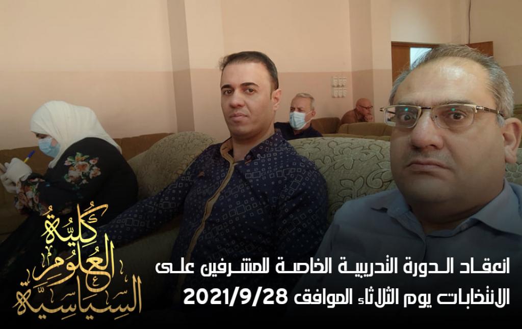 شارك كل من الأستاذ المساعد الدكتور صلاح الدين سليم و الأستاذ المساعد الدكتور مروان سالم علي والمدرس الدكتورة ميادة أحمد محمد في الدورة التدريبية الخاصة للمشرفين على الانتخابات، التي جرت صباح يوم الثلاثاء الموافق 28 ايلول 2021 في كلية الاداب بجامعة الموصل. وقد حضر السيد عميد كلية العلوم السياسية الأستاذ المساعد الدكتور طارق محمدطيب القصَّار هذه الورشة، التي بيَّنت الكثير من الجوانب المهمة في عمل المشرفين وماهية الاجراءات والاستعدادات لانتخابات مجلس النواب القادمة، والمزمع اجرائها في العاشر من شهر تشرين الاول القادم.