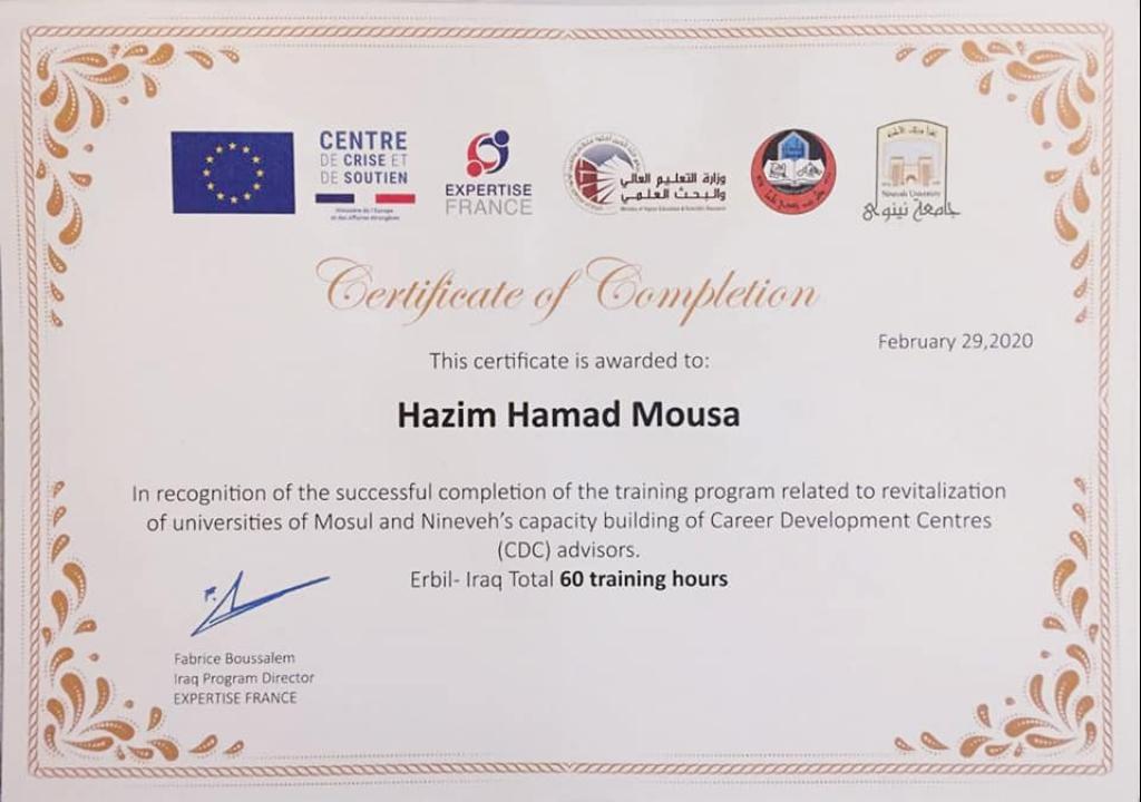 مشاركة مسؤول وحدة التأهيل والتوظيف في كلية العلوم السياسية في حفل التعاون المشترك بين جامعتي الموصل ونينوى ومؤسسة (Experties France)
