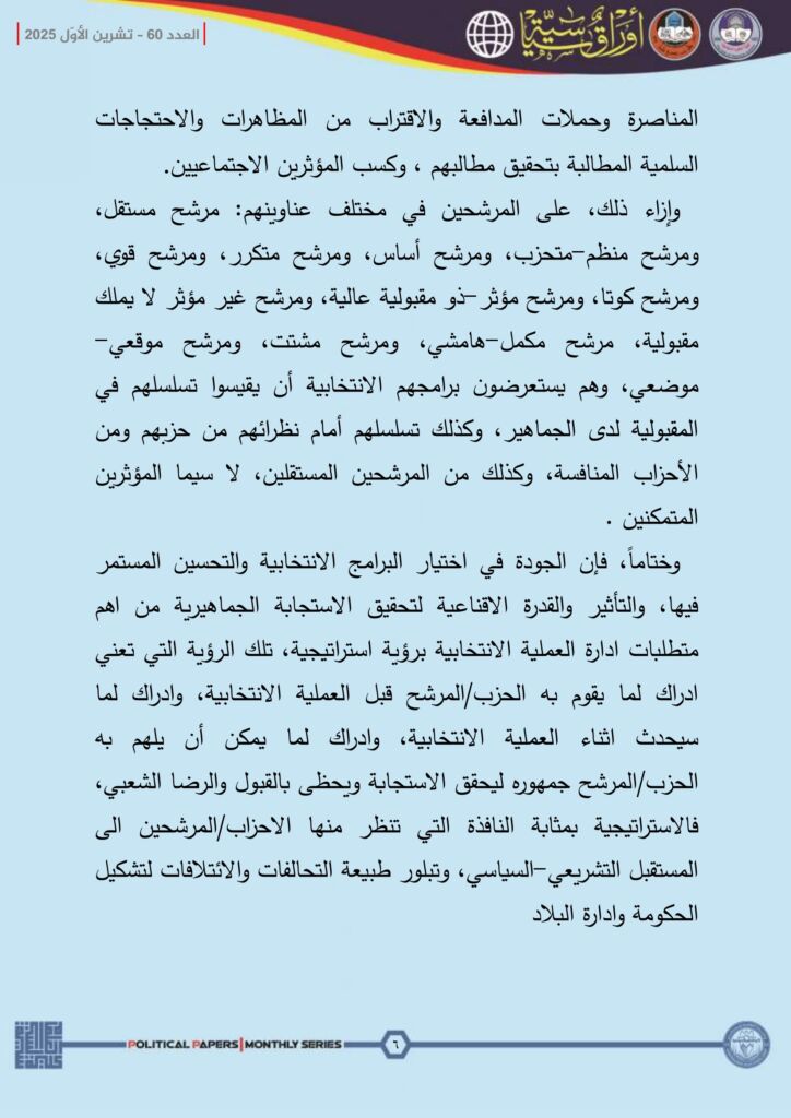 مقال رئيس فرع العلاقات الدولية الأستاذ الدكتور حازم حمد موسى في دورية: “أوراق سياسية”، بعددها الستين الصادر في تشرين الأول 2025، الموسوم: “استراتيجية إدارة الانتخابات النيابية بين رؤى الأحزاب وتطلعات الجماهير”..