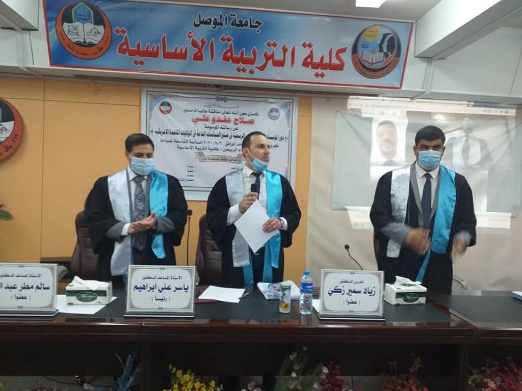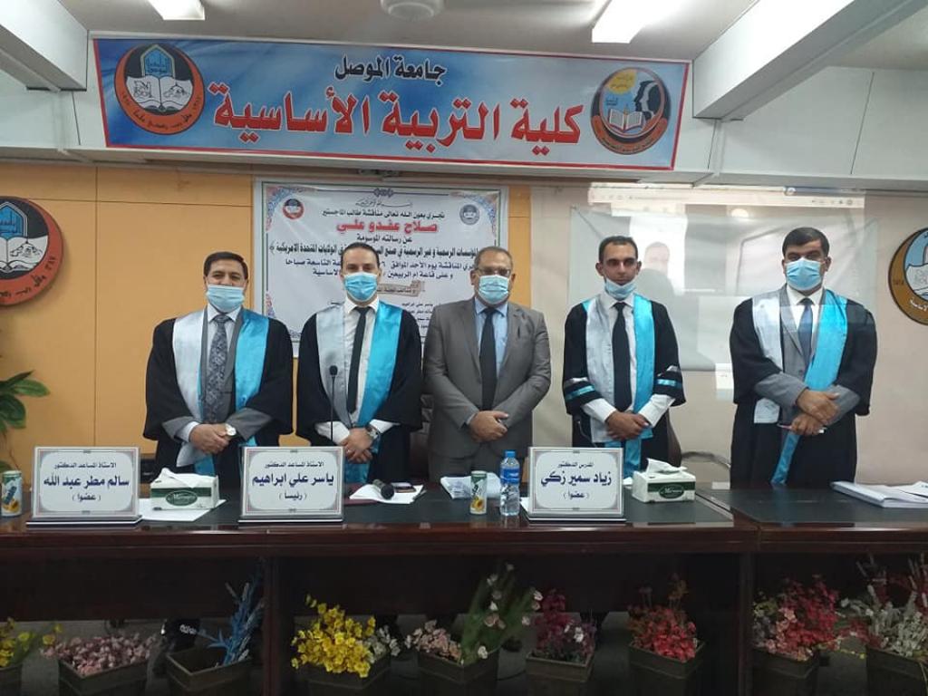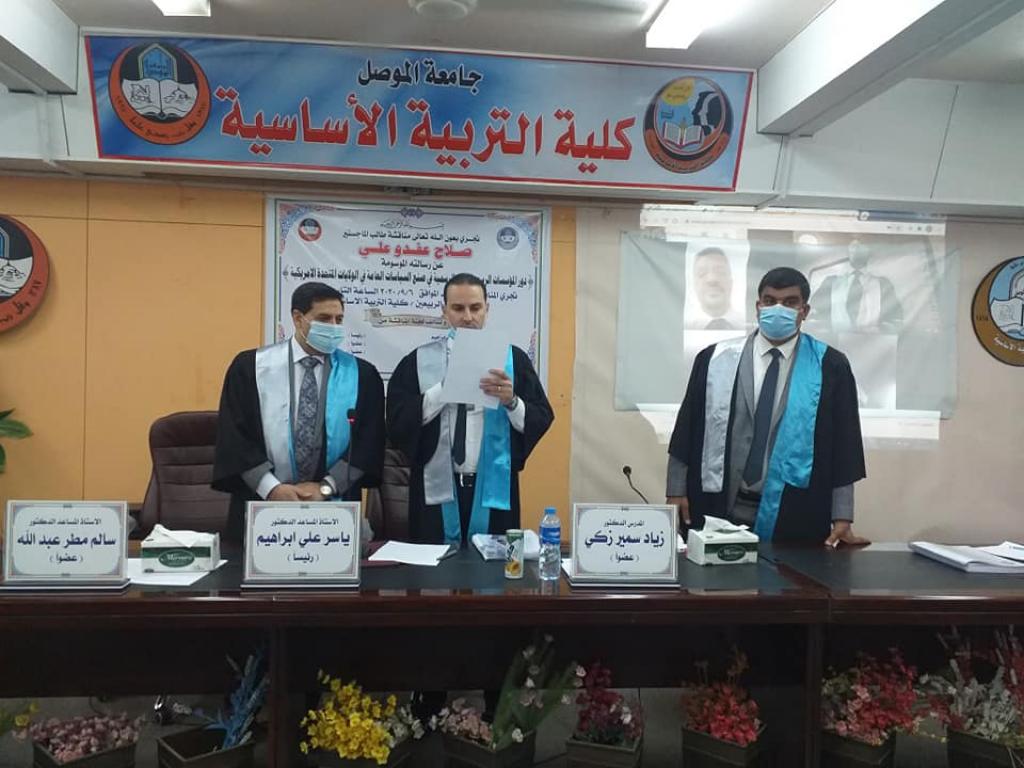 بحضور السيد عميد كلية العلوم السياسية الأستاذ المساعد الدكتور طارق محمدطيب القصار جرت صباح يوم الأحد الموافق ٦ / ٩ / ٢٠٢٠ الساعة التاسعة صباحا مناقشة رسالة الماجستير الموسومة (دور المؤسسات الرسمية وغير الرسمية في صنع السياسات العامة في الولايات المتحدة الأمريكية) للطالب صلاح عفدو علي ، في قاعة ام الربيعين / المجمع الثاني .وتألفت لجنة المناقشة من :١ – أ.م.د ياسر علي ابراهيم رئيساً .٢ – أ.م.د سالم مطر عبدالله عضواً .٣ – م.د زياد سمير زكي عضواً .٤ – أ.م.د محمود عزو حمدو عضواً ومشرفاً .وبعد مناقشة علمية ودفاع الطالب ، أجازت اللجنة الرسالة .