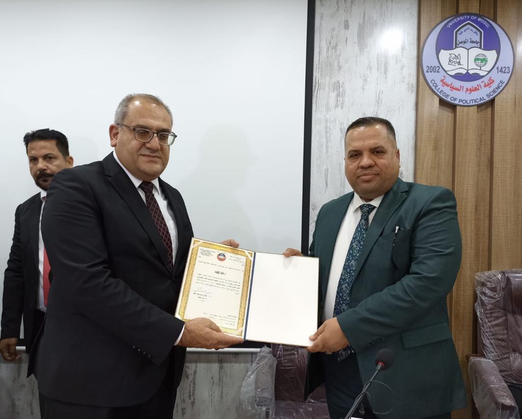 مناقشة رسالة ماجستير في كلية العلوم السياسية عن التهديد السيبراني للأمن الدولي في القرن الحادي والعشرين تحظى بحضور السيد رئيس جامعة الموصل الأستاذ الدكتور قصي كمال الدين الأحمدي