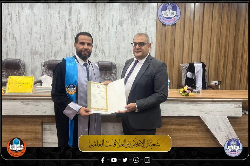 “منح كتاب شكرٍ وتقدير لرئيس لجنة مناقشة رسالة الماجستير”
