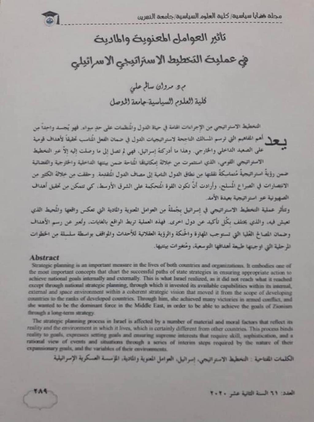 نشر الدكتور مروان سالم العلي التدريسي في فرع العلاقات الدولية، البحث الموسوم: ((تأثير العوامل المعنوية والمادية في عملية التخطيط الاستراتيجي الإسرائيلي))، إذ تطرق البحث الى إن الدول باختلاف الظروف والمتغيرات الداخلية والخارجية المحيطة بها لا تستطيع أن تتقدم دون أن ترسم لها خططاً استراتيجية تحافظ عبرها على كيانها ومستقبلها وطريقة حياتها وتحقق أهدافها القومية على الصعيدين الداخلي والخارجي. البحث منشور مجلة قضايا سياسية ، الصادرة عن كلية العلوم السياسية ، جامعة النهرين، بغداد ، العدد 61 لسنة 2020.