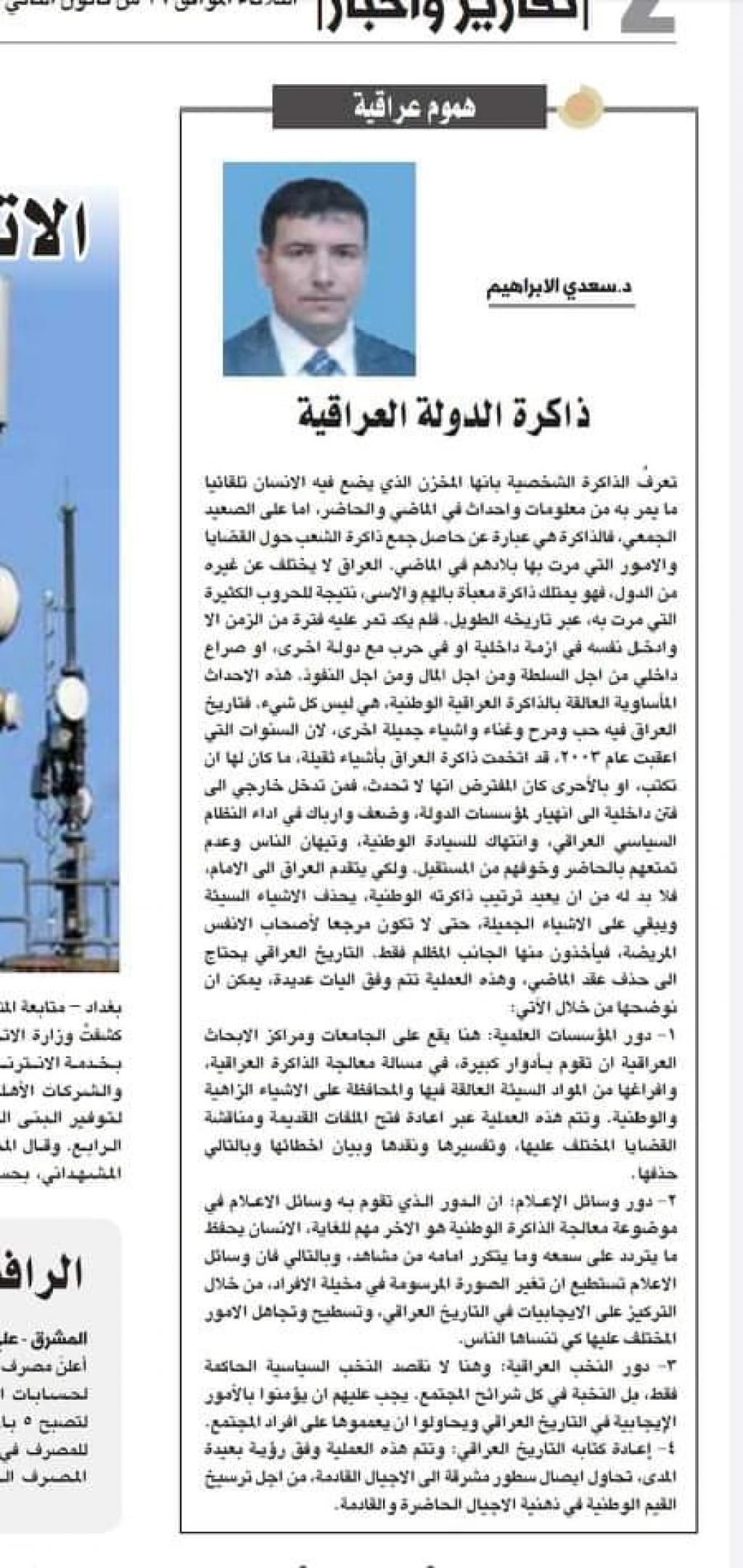نشر الدكتور سعدي الإبراهيم مقالا في جريدة المشرق الدولية (جريدة ورقية يومية) ، بعنوان ( ذاكرة الدولة العراقية) جاء فيه :الذاكرة الشخصية هي المخزن الذي يضع فيه الإنسان تلقائيا معلوماته حول ما تمر به من أحداث، أما الذاكرة الجمعية، فهي حاصل جمع ذاكرة المواطنين في شعب من الشعوب حول الأحداث التي مرت بها بلادهم .ذاكرة العراق، متخمة بالحزن والالم، بسبب الأزمات والحروب الكثيرة التي مرت به، وهي بامس الحاجة إلى معالجة علمية ((مسح ما علق فيها من احزان والإبقاء على الأشياء الوطنية والسعيدة والمفرحة) … وهذه العملية (اي إعادة صياغة الذاكرة الجمعية)، من الممكن أن تتم من خلال الآليات الآتية:١- من خلال المؤسسات العلمية والبحثية، عبر إعادة فتح الملفات وتفسيرها، ودحض السلبي منها وابراز الصفحات الإيجابية في التاريخ العراقي .وتلعب المناهج الدراسية والأبحاث الدور الأهم في هذا المجال .٢- عبر وسائل الإعلام، الانسان يحفظ ما يتكرر من مشاهد وما يسمعه من معلومات، وهنا يأتي دور وسائل الإعلام في الترويج والتركيز على الأحداث الوطنية التي تلاحم فيها العراقيين، وتسفيه الأحداث السيئة التي عاشتها دولتهم.٣- عن طريق النخبة: في كل الميادين توجد عناصر متميزة في محيطها ، وهي قادرة على التأثير في الاخرين، وبالتالي هذه النخب تستطيع أن تسهم في إعادة بناء الذاكرة العراقية، من خلال نشر الوعي حول الصفحات المضيئة في السفر الوطني العراقي.