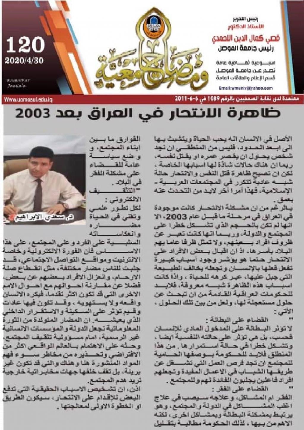 نشر الدكتور سعدي الابراهيم التدريسي في فرع السياسة العامة مقال علمي في جريدة ((ومضات جامعية)) ، وهي جريدة تصدر عن جامعة الموصل ، العدد 120 ، بعنوان ((ظاهرة الانتحار في المجتمع العراقي)).ملخص المقال :الانتحار هو الهروب من الحياة الى الموت ، الاصل في الانسان انه يحب الحياة لكن هناك اسباب تجعله يكرهها وتدفعه لتركها.***** بعض الاسباب :1 – الثورة المعلوماتية عقدت الحياة وحولت الانسان الى مخلوق صناعي تديره الاجهزة وتحيطه من كل جانب، فضيعت عليه سمة اللقاء المباشر مع المجتمع بوصفه كائن اجتماعي .2 – البطالة، تجعل العقل يفكر بالسلبيات فقط ، ويعقد الامور ويهولها الى درجة الانهيار .3 – الفقر، والحاجة ، تفقدان بغية الجوانب محاسنها .4 – اسباب اخرى … .**** بعض الحلول :1 – القضاء على المشاكل العامة في العراق، واولها البطالة والفقر، كي ينشغل الناس بالكد والعمل .2 – ان تنتهي الفورة الالكترونية، اما بالتثقيف حول مخاطر تسليم العقل للاجهزة الالكترونية، واما الانتظار حتى تمل البشرية من التقنية والتعقيد وتعود للفطرة السليمة.3 – ايقاف التنمر والظلم الاسري عن طريق ((نشر الوعي)) ، فكل اسرة هي عالم مصغر، وكل فرد قد يكره حياته عندما يضيق عليه هذا العالم.4 – حلول اخرى ….