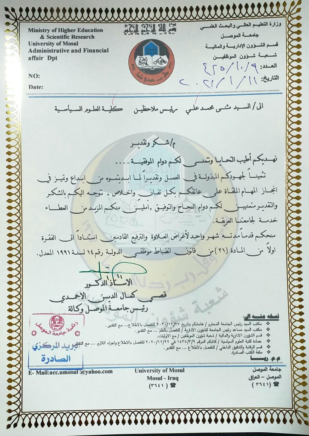 منح السيد رئيس جامعة الموصل الأستاذ الدكتور قصي كمال الدين الأحمدي كتاب شكر وتقدير للسيد مثنى محمد علي تثمينا لجهوده التي قدمها في أداء مهام عمله مسؤولاً لشعبة الخدمات الإدارية ..مبارك للسيد مثنى محمد علي …