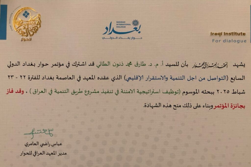 فوز تدريسي كلية العلوم السياسية جامعة الموصل الأستاذ المساعد الدكتور طارق محمد ذنون الطائي بجائزة مؤتمر حوار بغداد الدولي السابع