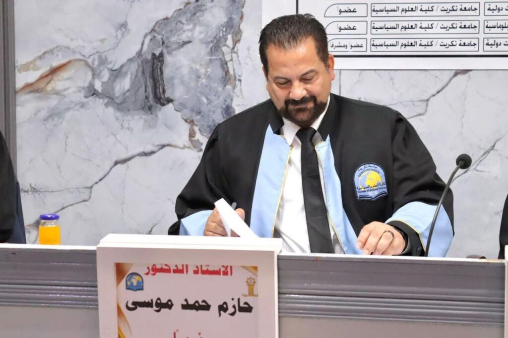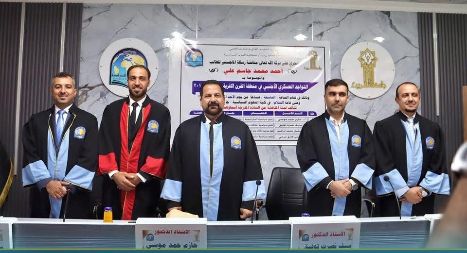 رئيس فرع العلاقات الدولية لكلية العلوم السياسية جامعة الموصل رئيساً لِلَجنة مناقشة رسالة ماجستير بجامعة تكريت عن التواجد العسكري الأجنبي في منطقة القرن الافريقي