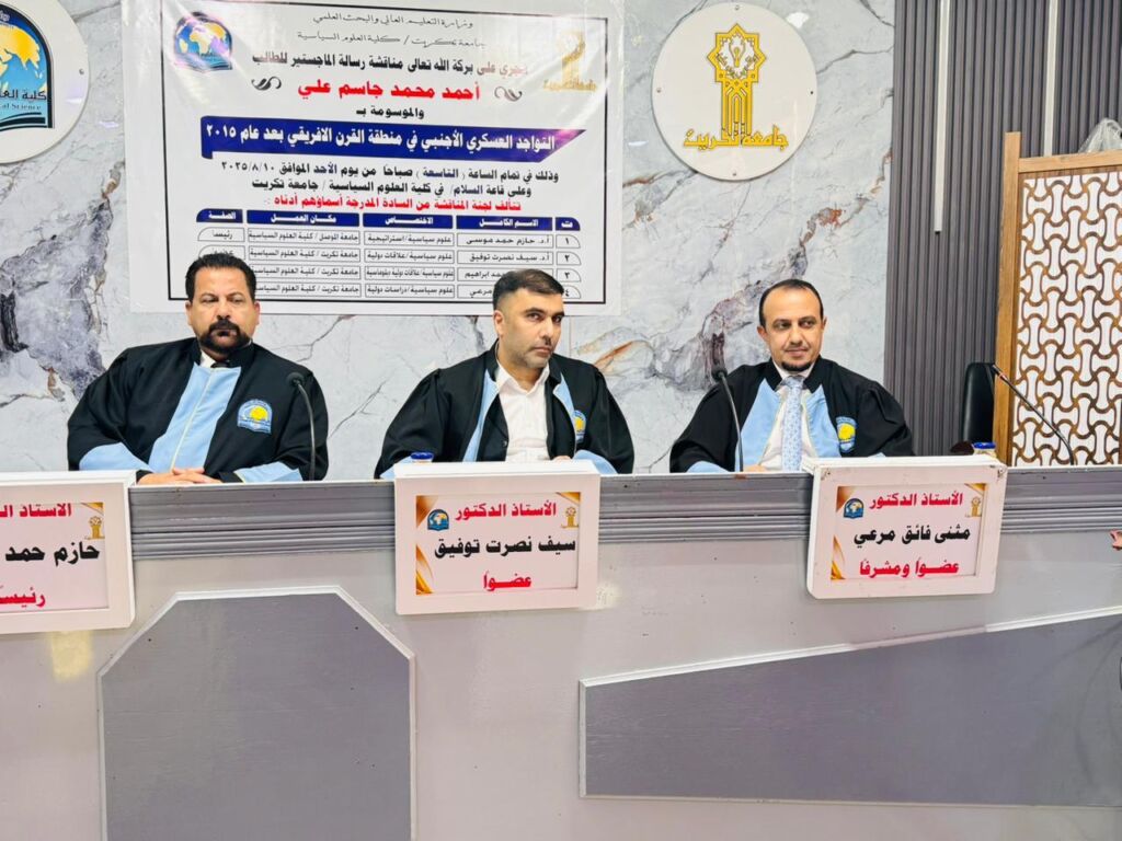 تنفيذاً لأهداف التنمية المستدامة، السادس عشر: السلام والعدل والمؤسسات القوية، والسابع عشر: عقد الشراكات لتحقيق الأهداف؛ نوقشت في كلية العلوم السياسية بجامعة تكريت رسالة الماجستير للطالب أحمد محمد جاسم، والموسومة: “التواجد العسكري الأجنبي في منطقة القرن الأفريقي بعد عام 2015″، وذلك يوم الأحد 10 آب 2025.